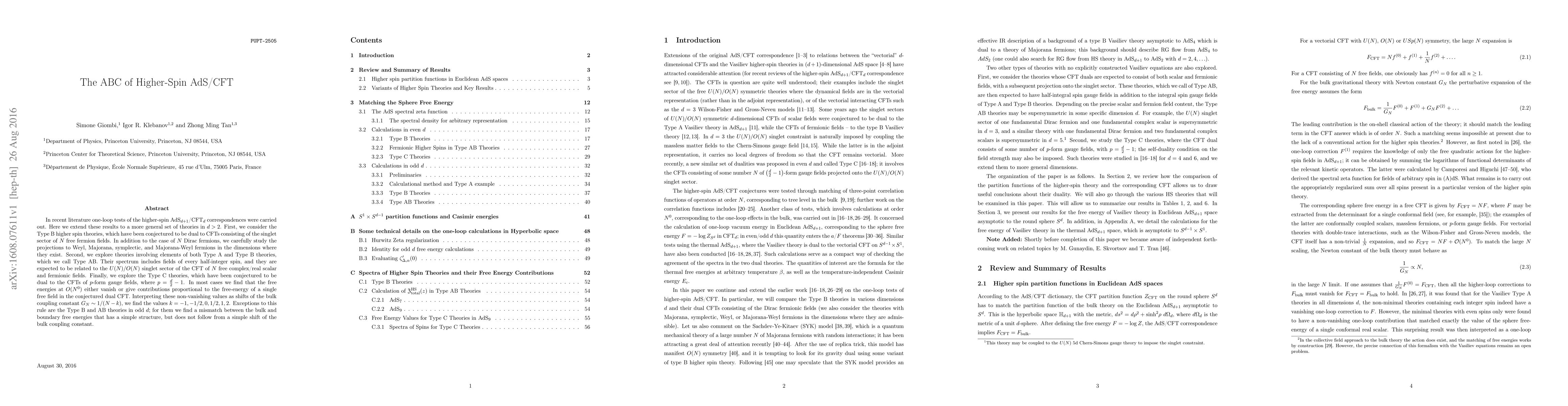 In recent literature one-loop tests of the higher-spin AdS$_{d+1}$/CFT$_d$ correspondences were carried out. Here we extend these results to a more general set of theories in $d>2$. First, we consider the Type B higher spin theories, which have been conjectured to be dual to CFTs consisting of the singlet sector of $N$ free fermion fields. In addition to the case of $N$ Dirac fermions, we carefully study the projections to Weyl, Majorana, symplectic, and Majorana-Weyl fermions in the dimensions where they exist. Second, we explore theories involving elements of both Type A and Type B theories, which we call Type AB. Their spectrum includes fields of every half-integer spin, and they are expected to be related to the $U(N)/O(N)$ singlet sector of the CFT of $N$ free complex/real scalar and fermionic fields. Finally, we explore the Type C theories, which have been conjectured to be dual to the CFTs of $p$-form gauge fields, where $p=\frac d 2 -1$. In most cases we find that the free energies at $O(N^0)$ either vanish or give contributions proportional to the free-energy of a single free field in the conjectured dual CFT. Interpreting these non-vanishing values as shifts of the bulk coupling constant $G_N\sim 1/(N-k)$, we find the values $k=-1, -1/2, 0, 1/2, 1, 2$. Exceptions to this rule are the Type B and AB theories in odd $d$; for them we find a mismatch between the bulk and boundary free energies that has a simple structure, but does not follow from a simple shift of the bulk coupling constant.