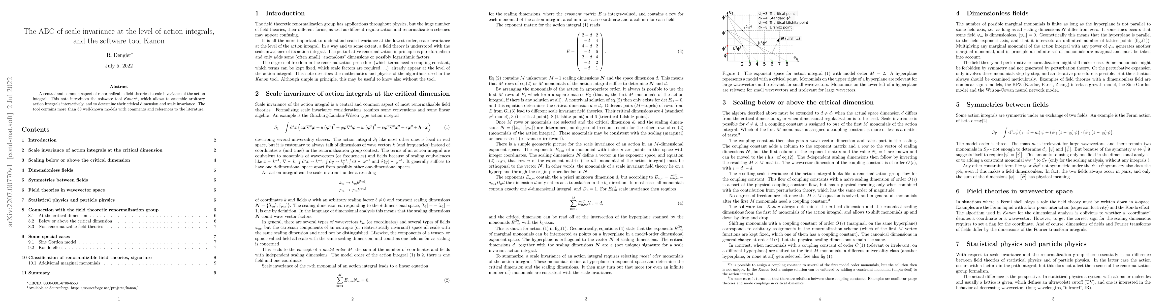 Summary: This paper discusses the concept of scale invariance in renormalizable field theories and introduces \emph{Kanon}, a software tool for interactively constructing and analyzing action integrals, including determining their critical dimension and scale invariance. The tool includes over 60 models with detailed comments and references.