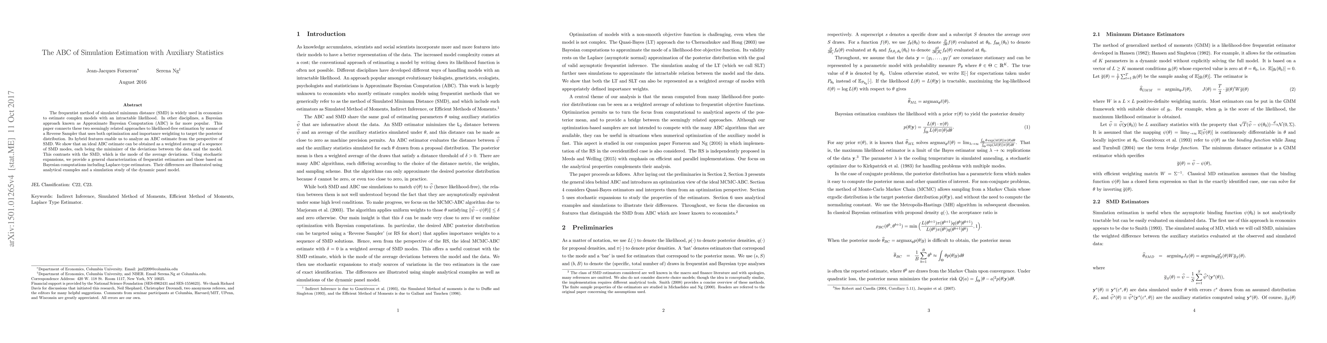 The frequentist method of simulated minimum distance (SMD) is widely used in economics to estimate complex models with an intractable likelihood. In other disciplines, a Bayesian approach known as Approximate Bayesian Computation (ABC) is far more popular. This paper connects these two seemingly related approaches to likelihood-free estimation by means of a Reverse Sampler that uses both optimization and importance weighting to target the posterior distribution. Its hybrid features enable us to analyze an ABC estimate from the perspective of SMD. We show that an ideal ABC estimate can be obtained as a weighted average of a sequence of SMD modes, each being the minimizer of the deviations between the data and the model. This contrasts with the SMD, which is the mode of the average deviations. Using stochastic expansions, we provide a general characterization of frequentist estimators and those based on Bayesian computations including Laplace-type estimators. Their differences are illustrated using analytical examples and a simulation study of the dynamic panel model.