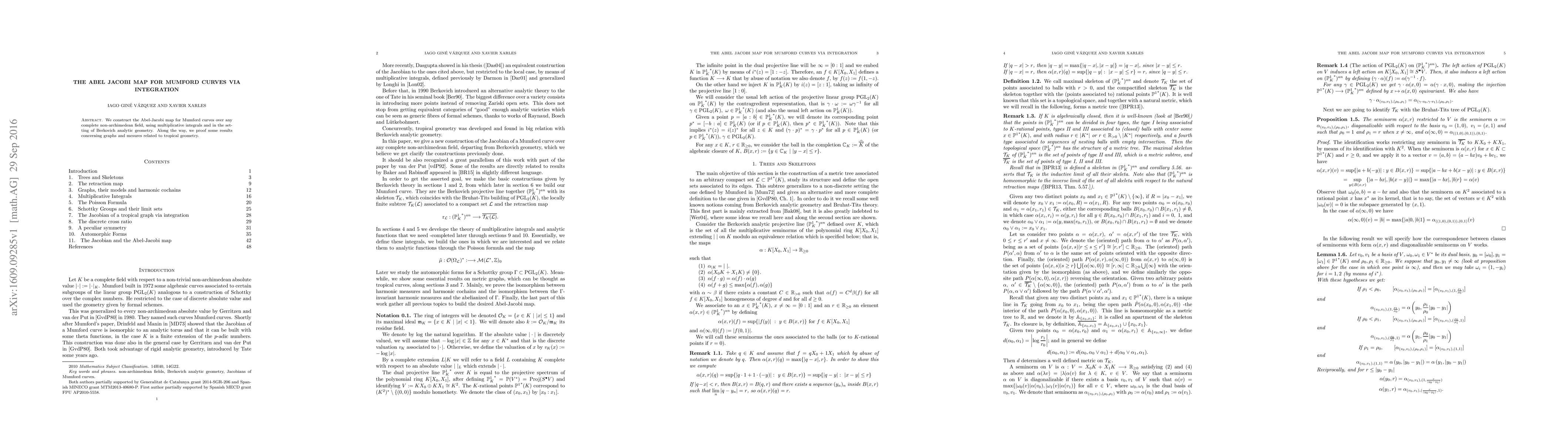 The paper constructs the Abel-Jacobi map for Mumford curves over complete non-archimedean fields using multiplicative integrals within Berkovich geometry, and proves related results in tropical geometry. This work integrates insights from both algebraic and analytic settings.