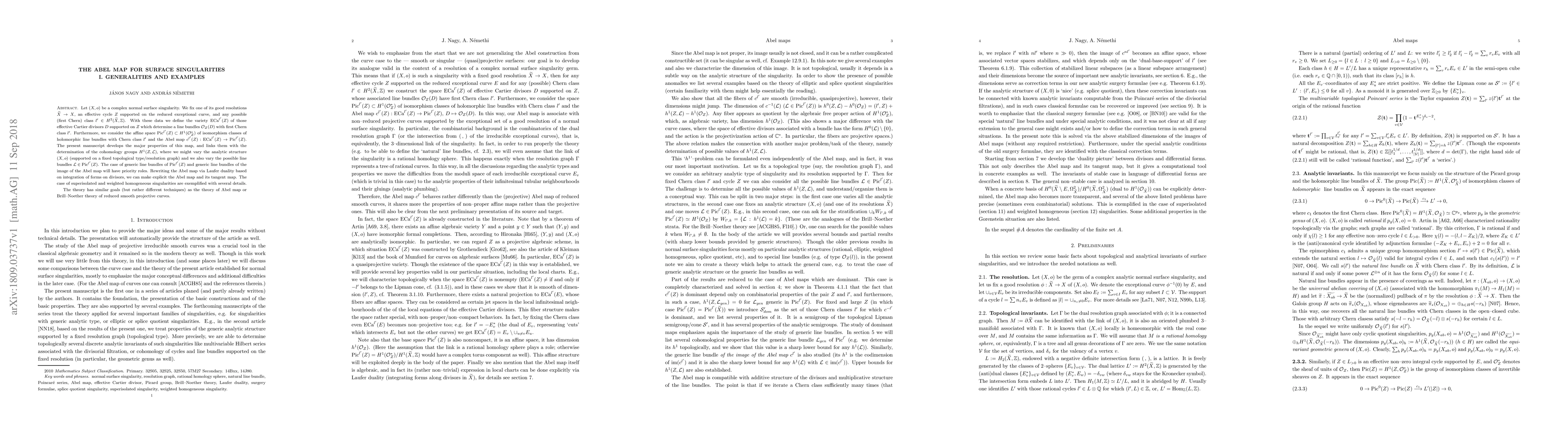 Let $(X,o)$ be a complex normal surface singularity. We fix one of its good resolutions $\widetilde{X}\to X$, an effective cycle $Z$ supported on the reduced exceptional curve, and any possible (first Chern) class $l'\in H^2(\widetilde{X},\mathbb{Z})$. With these data we define the variety ${\rm ECa}^{l'}(Z)$ of those effective Cartier divisors $D$ supported on $Z$ which determine a line bundles $\mathcal{O}_Z(D)$ with first Chern class $l'$. Furthermore, we consider the affine space ${\rm Pic}^{l'}(Z)\subset H^1(\mathcal{O}_Z^*)$ of isomorphism classes of holomorphic line bundles with Chern class $l'$ and the Abel map $c^{l'}(Z):{\rm ECa}^{l'}(Z)\to {\rm Pic}^{l'}(Z)$. The present manuscript develops the major properties of this map, and links them with the determination of the cohomology groups $H^1(Z,\mathcal{L})$, where we might vary the analytic structure $(X,o)$ (supported on a fixed topological type/resolution graph) and we also vary the possible line bundles ${\mathcal{L}}\in {\rm Pic}^{l'}(Z)$. The case of generic line bundles of ${\rm Pic}^{l'}(Z)$ and generic line bundles of the image of the Abel map will have priority roles. Rewriting the Abel map via Laufer duality based on integration of forms on divisors, we can make explicit the Abel map and its tangent map. The case of superisolated and weighted homogeneous singularities are exemplified with several details. The theory has similar goals (but rather different techniques) as the theory of Abel map or Brill--Noether theory of reduced smooth projective curves.