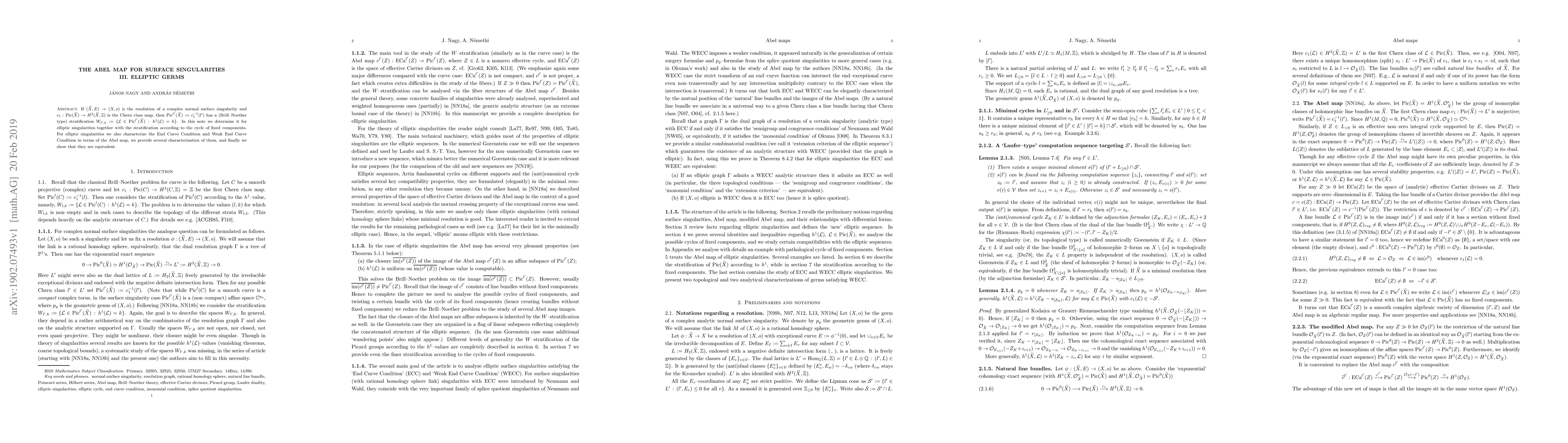 This paper investigates the Abel map for elliptic germs in complex normal surface singularities, focusing on the stratification of the Picard group by the number of fixed components. It characterizes the End Curve Condition and Weak End Curve Condition via the Abel map, proving their equivalence.