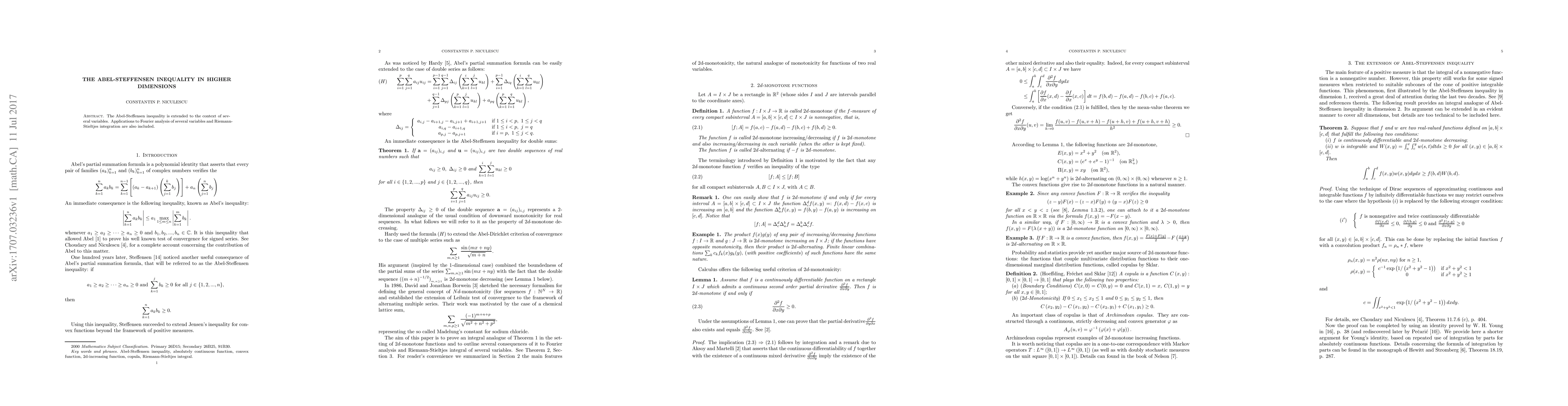The Abel-Steffensen inequality is extended to the context of several variables. Applications to Fourier analysis of several variables and Riemann-Stieltjes integration are also included.