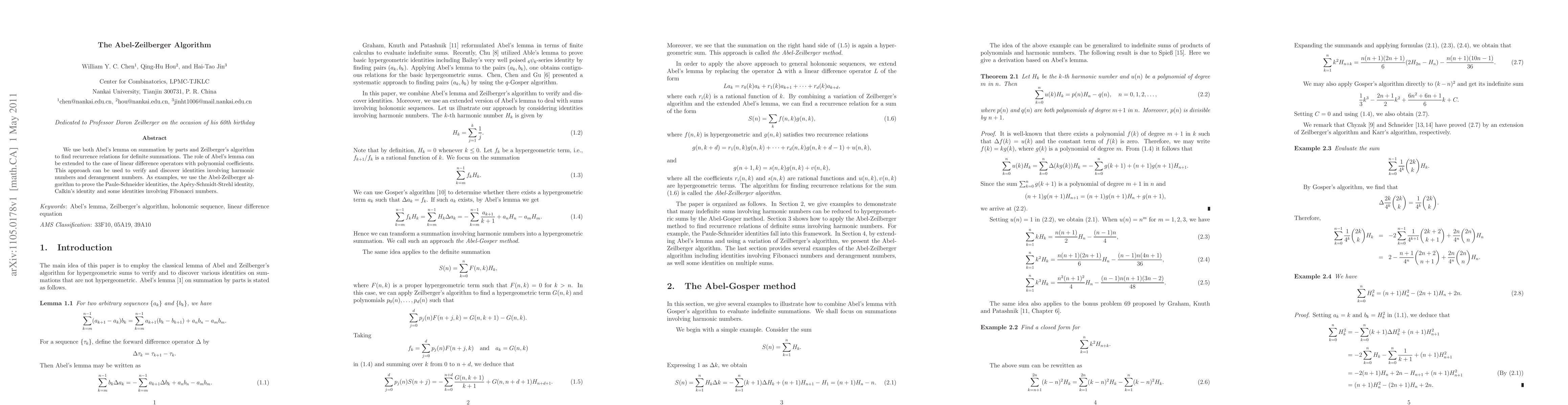 The Abel-Zeilberger Algorithm combines Abel's summation by parts and Zeilberger's recurrence relation method to find recurrences for definite summations, extending to linear difference operators with polynomial coefficients. It verifies and discovers identities involving harmonic and derangement numbers, proving notable identities like the Paule-Schneider and Apery-Schmidt-Strehl identities.