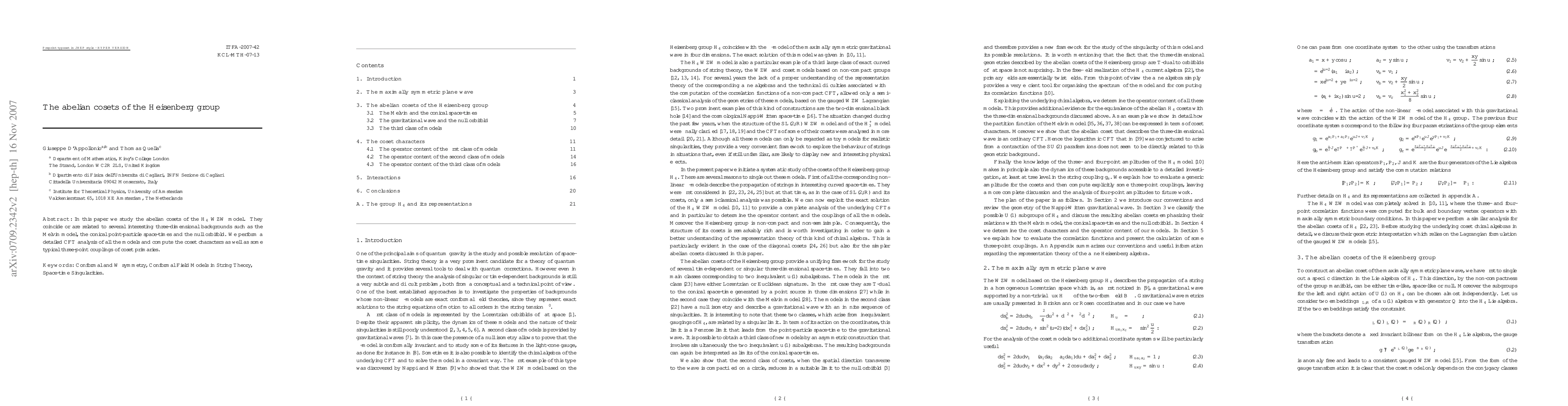 In this paper we study the abelian cosets of the H(4) WZW model. They coincide or are related to several interesting three-dimensional backgrounds such as the Melvin model, the conical point-particle space-times and the null orbifold. We perform a detailed CFT analysis of all the models and compute the coset characters as well as some typical three-point couplings of coset primaries.