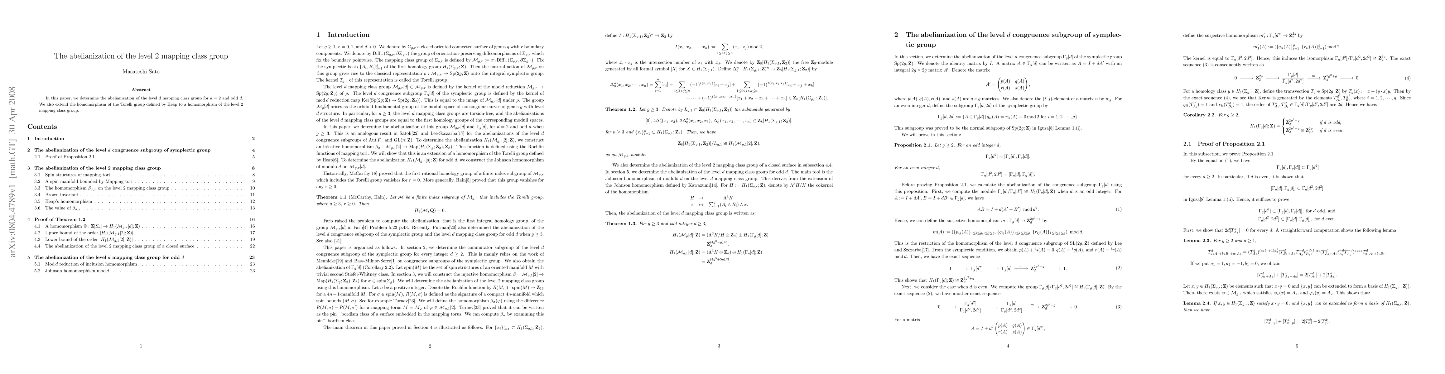 This paper determines the abelianization of the level 2 mapping class group and extends Heap's homomorphism of the Torelli group to the level 2 mapping class group. It also discusses the abelianization for odd level d mapping class groups.