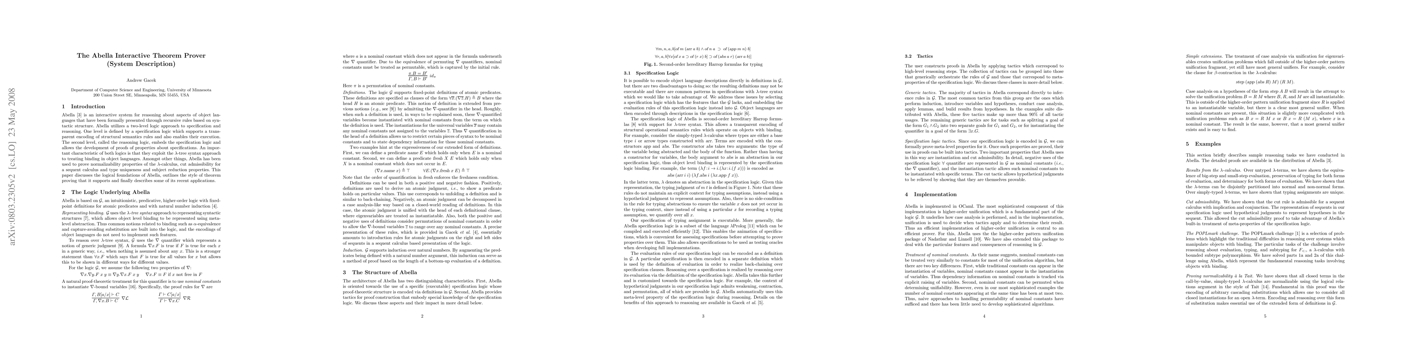 Abella is an interactive theorem prover employing a two-level logic for reasoning about formal object languages, with applications in proving properties like normalizability and type uniqueness. It supports a transparent encoding of structural semantics and utilizes a lambda tree syntax approach for binding.