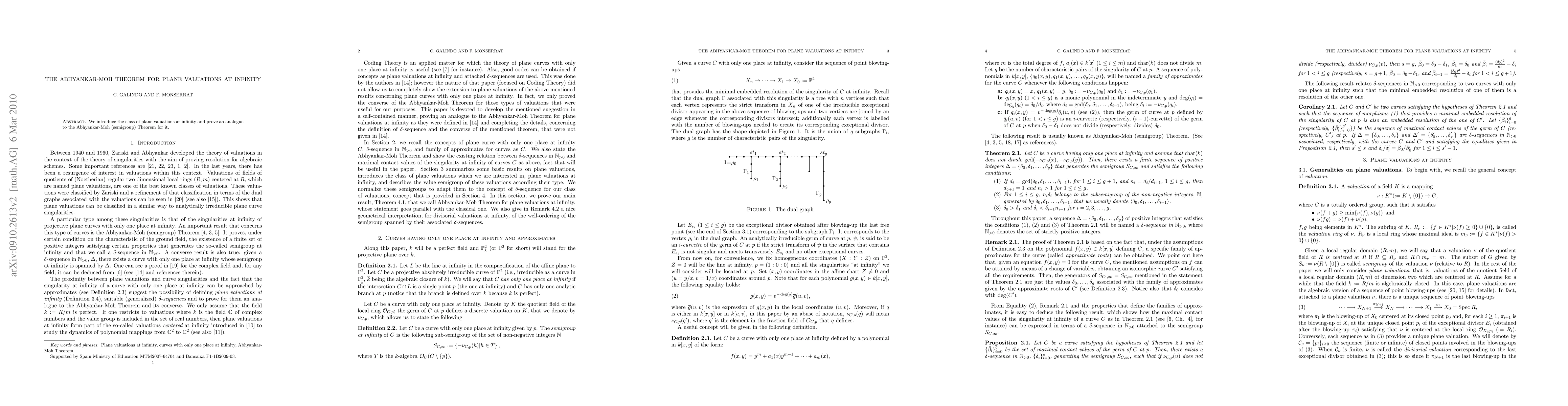 Summary: This paper introduces plane valuations at infinity and establishes an analogue of the Abhyankar-Moh theorem for these valuations, extending the original theorem's applicability to the infinite plane.