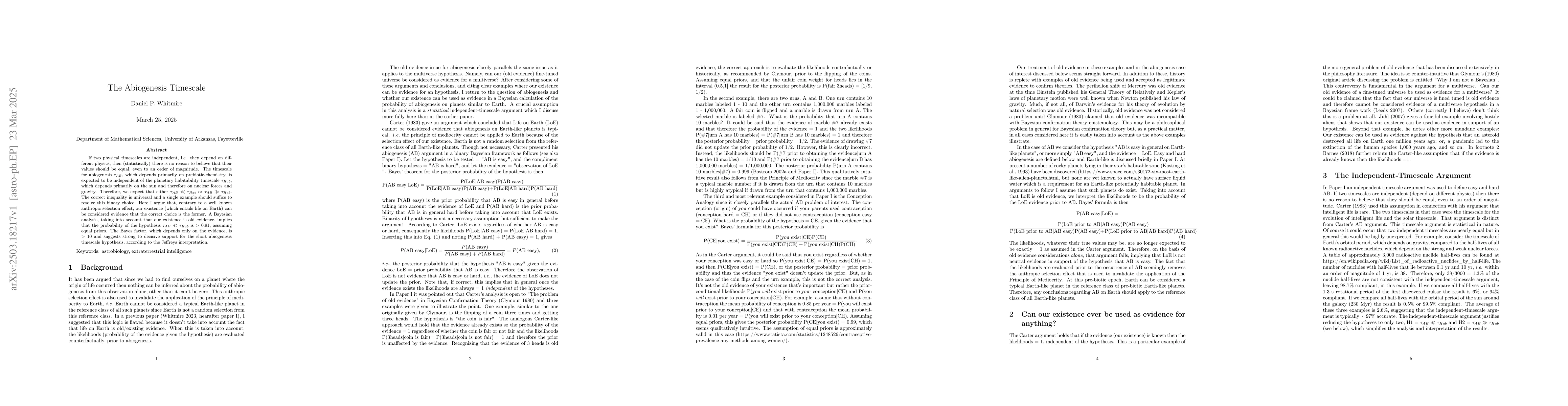 This paper argues that the timescale for abiogenesis ($\tau_{AB}$) is likely much shorter than the timescale for planetary habitability ($\tau_{Hab}$), based on a Bayesian analysis. The author concludes that our existence provides strong evidence favoring $\tau_{AB} \ll \tau_{Hab}$, with a Bayes factor greater than 10 supporting this hypothesis.