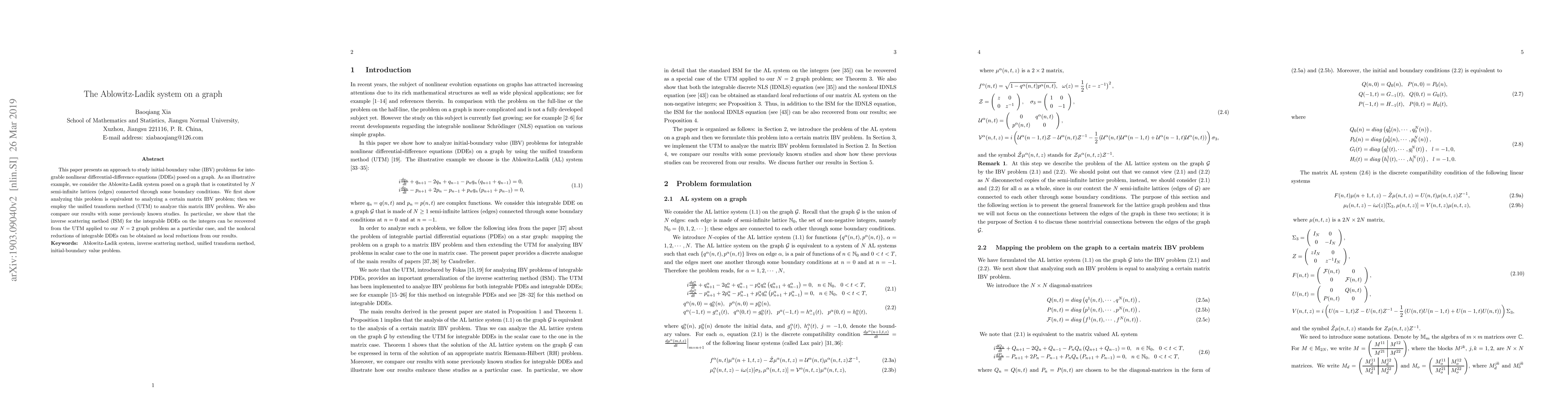 This paper presents an approach to study initial-boundary value (IBV) problems for integrable nonlinear differential-difference equations (DDEs) posed on a graph. As an illustrative example, we consider the Ablowitz-Ladik system posed on a graph that is constituted by $N$ semi-infinite lattices (edges) connected through some boundary conditions. We first show analyzing this problem is equivalent to analyzing a certain matrix IBV problem; then we employ the unified transform method (UTM) to analyze this matrix IBV problem. We also compare our results with some previously known studies. In particular, we show that the inverse scattering method (ISM) for the integrable DDEs on the integers can be recovered from the UTM applied to our $N=2$ graph problem as a particular case, and the nonlocal reductions of integrable DDEs can be obtained as local reductions from our results.