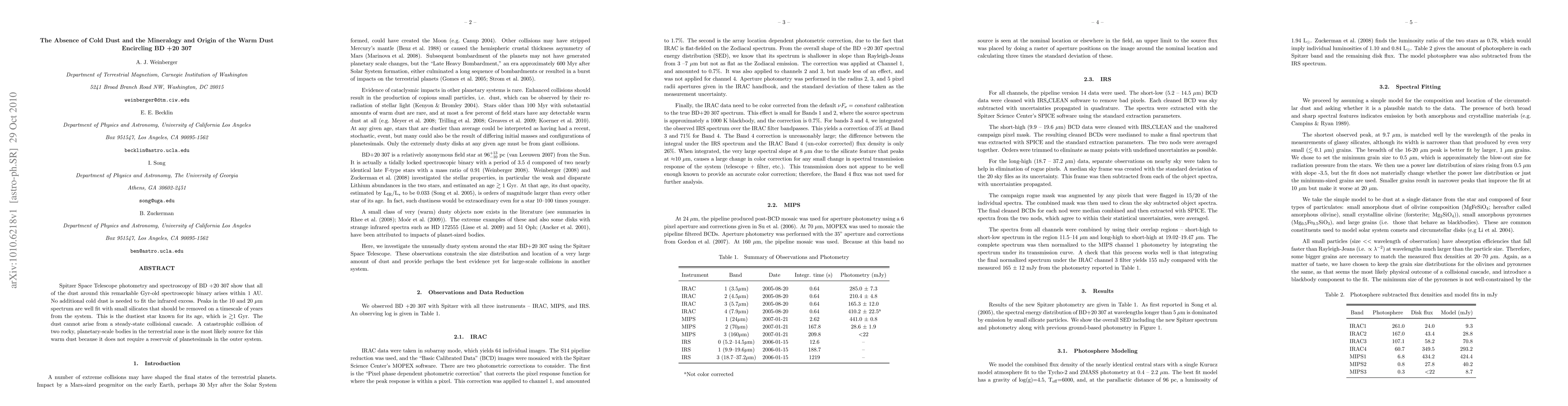 Spitzer Space Telescope photometry and spectroscopy of BD +20 307 show that all of the dust around this remarkable Gyr-old spectroscopic binary arises within 1 AU. No additional cold dust is needed to fit the infrared excess. Peaks in the 10 and 20 micron spectrum are well fit with small silicates that should be removed on a timescale of years from the system. This is the dustiest star known for its age, which is >1 Gyr. The dust cannot arise from a steady-state collisional cascade. A catastrophic collision of two rocky, planetary-scale bodies in the terrestrial zone is the most likely source for this warm dust because it does not require a reservoir of planetesimals in the outer system.