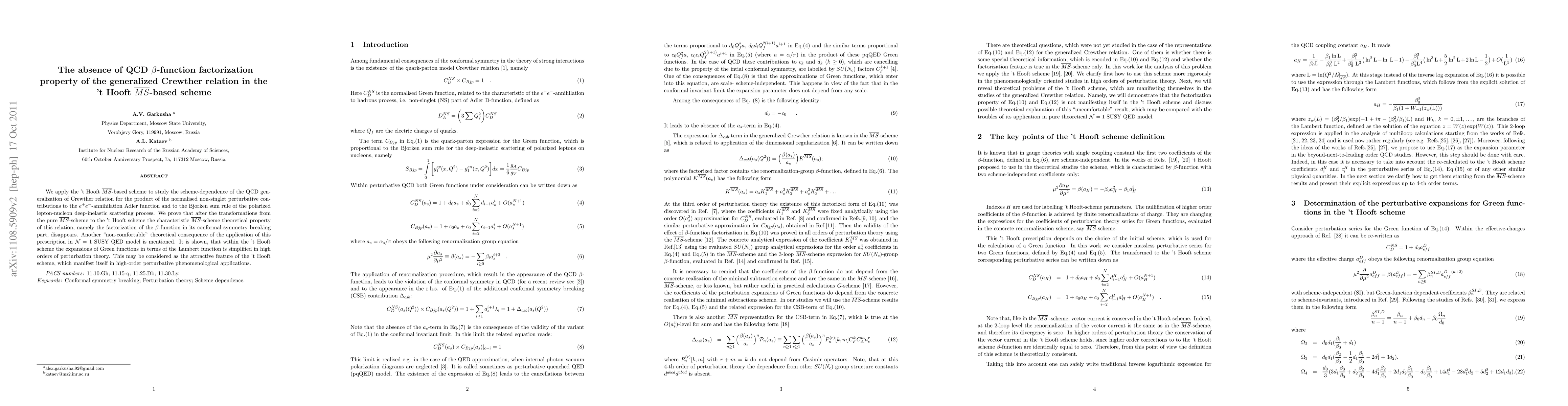 We apply the 't Hooft $\bar{MS}$-based scheme to study the scheme-dependence of the QCD generalization of Crewther relation for the product of the normalised non-singlet perturbative contributions to the $e^+e^-$-annihilation Adler function and to the Bjorken sum rule of the polarized lepton-nucleon deep-inelastic scattering process. We prove that after the transformations from the pure $\bar{MS}$-scheme to the 't Hooft scheme the characteristic $\bar{MS}$-scheme theoretical property of this relation, namely the factorization of the $\beta$-function in its conformal symmetry breaking part, disappears. Another "non-comfortable" theoretical consequence of the application of this prescription in $\mathcal{N}=1$ SUSY QED model is mentioned. It is shown, that within the 't Hooft scheme the expansions of Green functions in terms of the Lambert function is simplified in high orders of perturbation theory. This may be considered as the attractive feature of the 't Hooft scheme, which manifest itself in high-order perturbative phenomenological applications.
