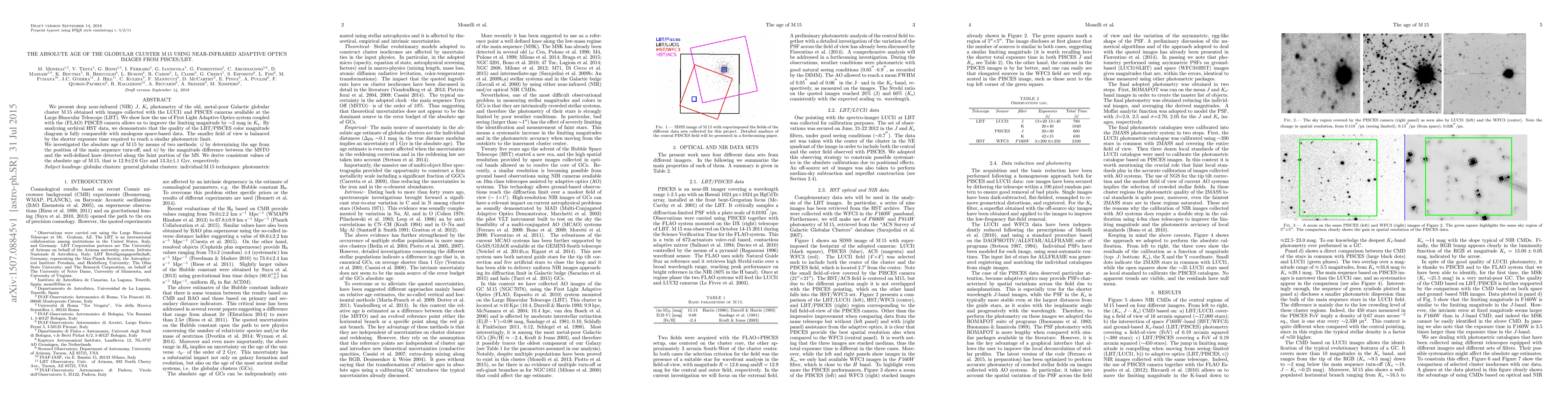 We present deep near-infrared (NIR) J, Ks photometry of the old, metal-poor Galactic globular cluster M\,15 obtained with images collected with the LUCI1 and PISCES cameras available at the Large Binocular Telescope (LBT). We show how the use of First Light Adaptive Optics system coupled with the (FLAO) PISCES camera allows us to improve the limiting magnitude by ~2 mag in Ks. By analyzing archival HST data, we demonstrate that the quality of the LBT/PISCES color magnitude diagram is fully comparable with analogous space-based data. The smaller field of view is balanced by the shorter exposure time required to reach a similar photometric limit. We investigated the absolute age of M\,15 by means of two methods: i) by determining the age from the position of the main sequence turn-off; and ii) by the magnitude difference between the MSTO and the well-defined knee detected along the faint portion of the MS. We derive consistent values of the absolute age of M15, that is 12.9+-2.6 Gyr and 13.3+-1.1 Gyr, respectively.