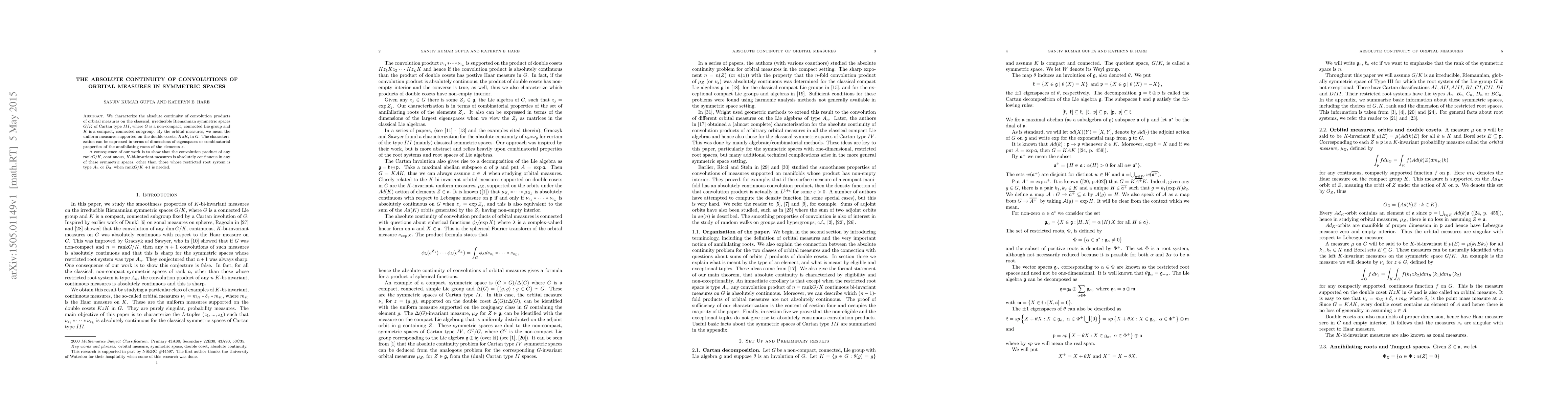 We characterize the absolute continuity of convolution products of orbital measures on the classical, irreducible Riemannian symmetric spaces $G/K$ of Cartan type $III$, where $G$ is a non-compact, connected Lie group and $K$ is a compact, connected subgroup. By the orbital measures, we mean the uniform measures supported on the double cosets, $KzK,$ in $G$. The characterization can be expressed in terms of dimensions of eigenspaces or combinatorial properties of the annihilating roots of the elements $z$. A consequence of our work is to show that the convolution product of any rank% $G/K,$ continuous, $K$-bi-invariant measures is absolutely continuous in any of these symmetric spaces, other than those whose restricted root system is type $A_{n}$ or $D_{3}$, when rank$G/K$ $+1$ is needed.