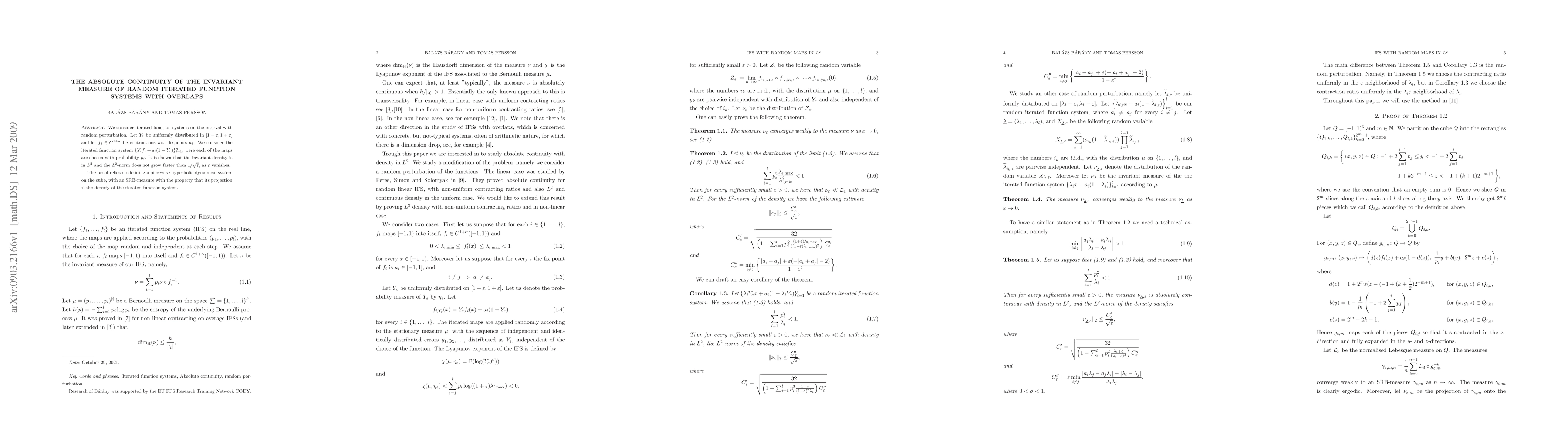 This paper investigates the absolute continuity of the invariant measure for random iterated function systems with overlaps. It demonstrates that the invariant density remains in $L^2$ and its $L^2$-norm decreases as $1/\sqrt{\epsilon}$ when $\epsilon$ approaches zero.