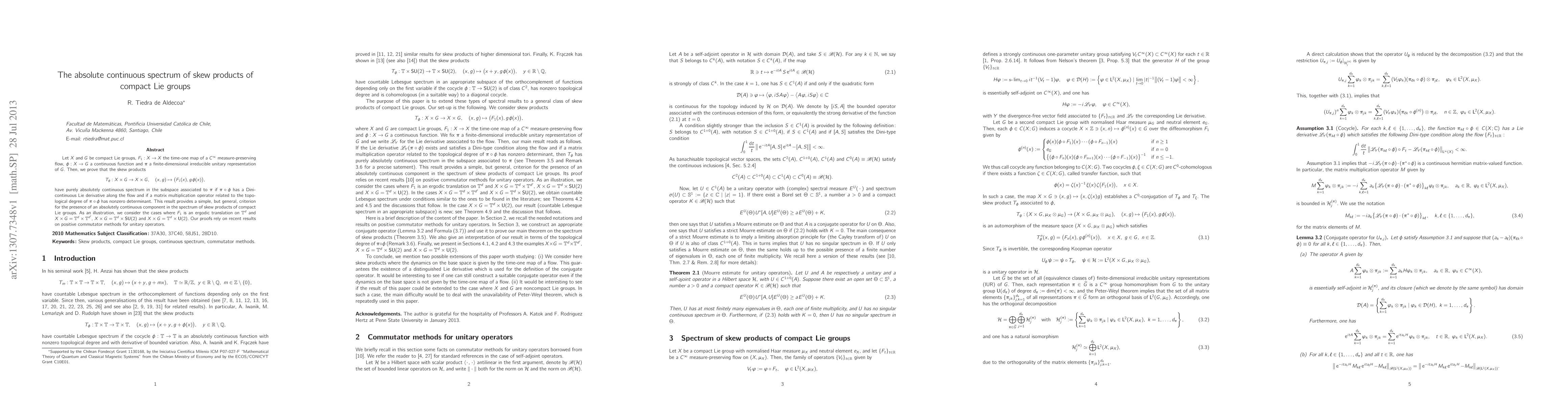 This paper proves that skew products of compact Lie groups have purely absolutely continuous spectrum under specific conditions, providing a criterion for the presence of an absolutely continuous component in their spectrum. The proofs utilize recent advancements in positive commutator methods for unitary operators.