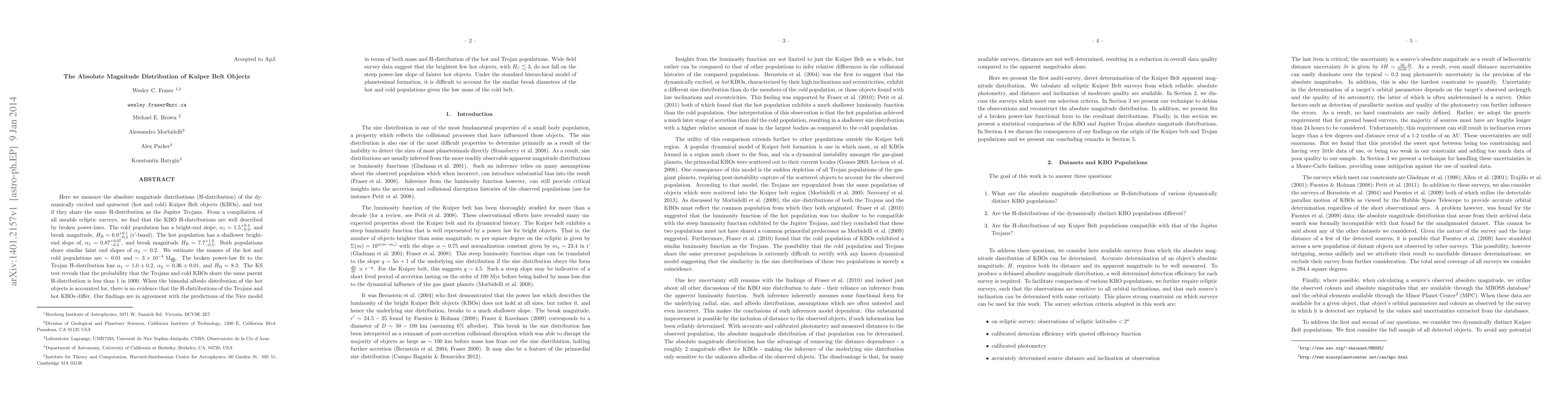 Here we measure the absolute magnitude distributions (H-distribution) of the dynamically excited and quiescent (hot and cold) Kuiper Belt objects (KBOs), and test if they share the same H-distribution as the Jupiter Trojans. From a compilation of all useable ecliptic surveys, we find that the KBO H-distributions are well described by broken power-laws. The cold population has a bright-end slope, $\alpha_{\textrm{1}}=1.5_{-0.2}^{+0.4}$, and break magnitude, $H_{\textrm{B}}=6.9_{-0.2}^{+0.1}$ (r'-band). The hot population has a shallower bright-end slope of, $\alpha_{\textrm{1}}=0.87_{-0.2}^{+0.07}$, and break magnitude $H_{\textrm{B}}=7.7_{-0.5}^{+1.0}$. Both populations share similar faint end slopes of $\alpha_2\sim0.2$. We estimate the masses of the hot and cold populations are $\sim0.01$ and $\sim3\times10^{-4} \mbox{ M$_{\bigoplus}$}$. The broken power-law fit to the Trojan H-distribution has $\alpha_\textrm{1}=1.0\pm0.2$, $\alpha_\textrm{2}=0.36\pm0.01$, and $H_{\textrm{B}}=8.3$. The KS test reveals that the probability that the Trojans and cold KBOs share the same parent H-distribution is less than 1 in 1000. When the bimodal albedo distribution of the hot objects is accounted for, there is no evidence that the H-distributions of the Trojans and hot KBOs differ. Our findings are in agreement with the predictions of the Nice model in terms of both mass and H-distribution of the hot and Trojan populations. Wide field survey data suggest that the brightest few hot objects, with $H_{\textrm{r'}}\lesssim3$, do not fall on the steep power-law slope of fainter hot objects. Under the standard hierarchical model of planetesimal formation, it is difficult to account for the similar break diameters of the hot and cold populations given the low mass of the cold belt.