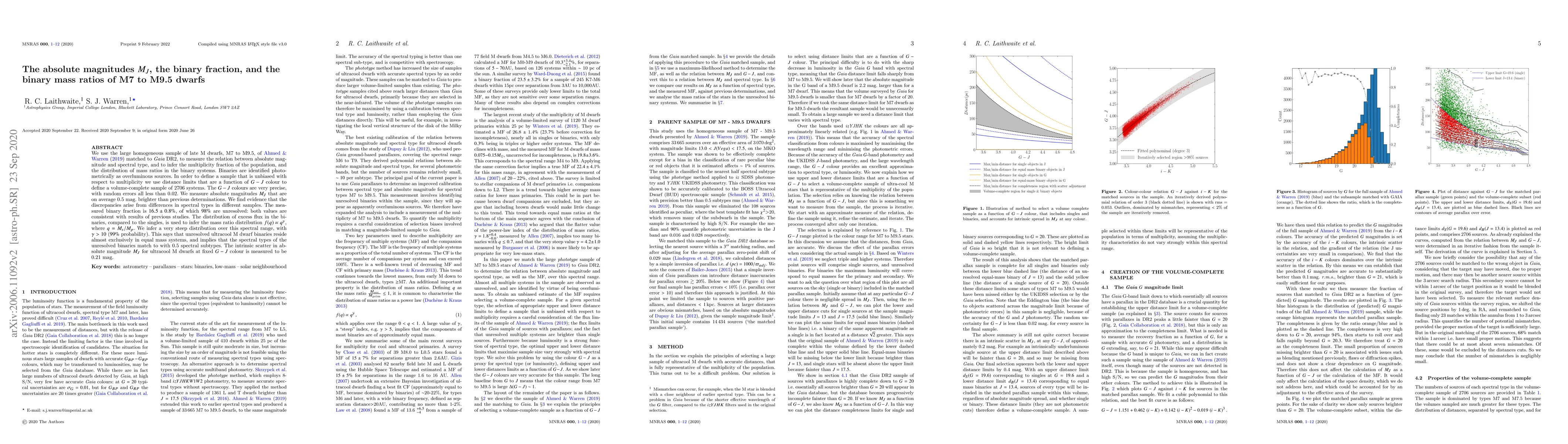 We use the large homogeneous sample of late M dwarfs, M7 to M9.5, of Ahmed & Warren (2019) matched to $\textit{Gaia}$ DR2, to measure the relation between absolute magnitude and spectral type, and to infer the multiplicity fraction of the population, and the distribution of mass ratios in the binary systems. Binaries are identified photometrically as overluminous sources. In order to define a sample that is unbiased with respect to multiplicity we use distance limits that are a function of $G-J$ colour to define a volume-complete sample of 2706 systems. The $G-J$ colours are very precise, with random errors all less than 0.02. We measure absolute magnitudes $M_J$ that are on average 0.5 mag. brighter than previous determinations. We find evidence that the discrepancies arise from differences in spectral types in different samples. The measured binary fraction is $16.5\pm0.8\%$, of which $98\%$ are unresolved: both values are consistent with results of previous studies. The distribution of excess flux in the binaries, compared to the singles, is used to infer the mass ratio distribution $f(q)\propto q^\gamma$, where $q=M_s/M_p$. We infer a very steep distribution over this spectral range, with $\gamma>10$ ($99\%$ probability). This says that unresolved ultracool M dwarf binaries reside almost exclusively in equal mass systems, and implies that the spectral types of the unresolved binaries match to with 0.5 spectral subtypes. The intrinsic scatter in absolute magnitude $M_J$ for ultracool M dwarfs at fixed $G-J$ colour is measured to be 0.21 mag.