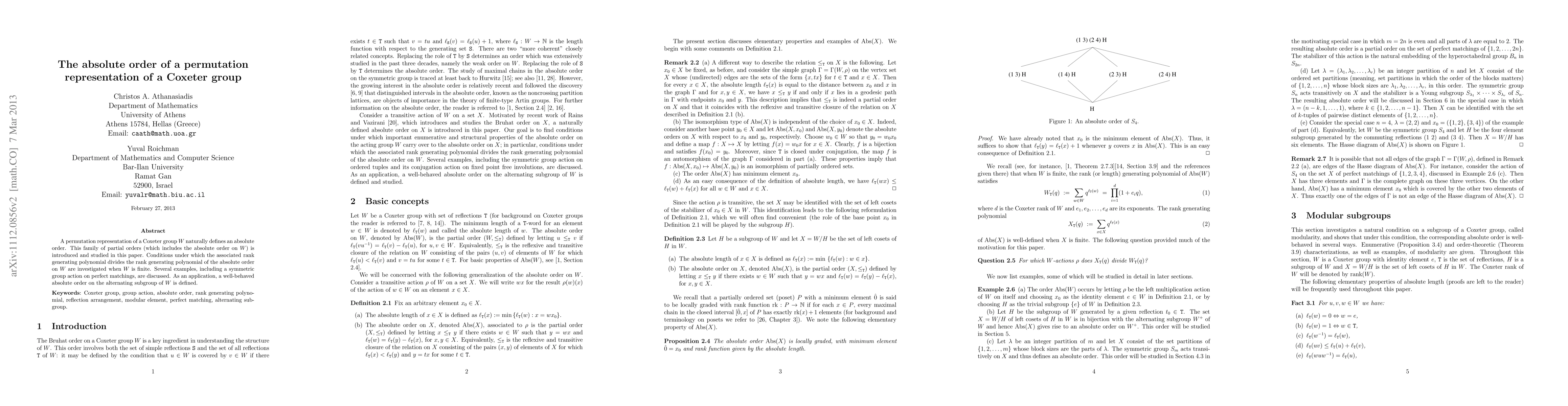 A permutation representation of a Coxeter group $W$ naturally defines an absolute order. This family of partial orders (which includes the absolute order on $W$) is introduced and studied in this paper. Conditions under which the associated rank generating polynomial divides the rank generating polynomial of the absolute order on $W$ are investigated when $W$ is finite. Several examples, including a symmetric group action on perfect matchings, are discussed. As an application, a well-behaved absolute order on the alternating subgroup of $W$ is defined.