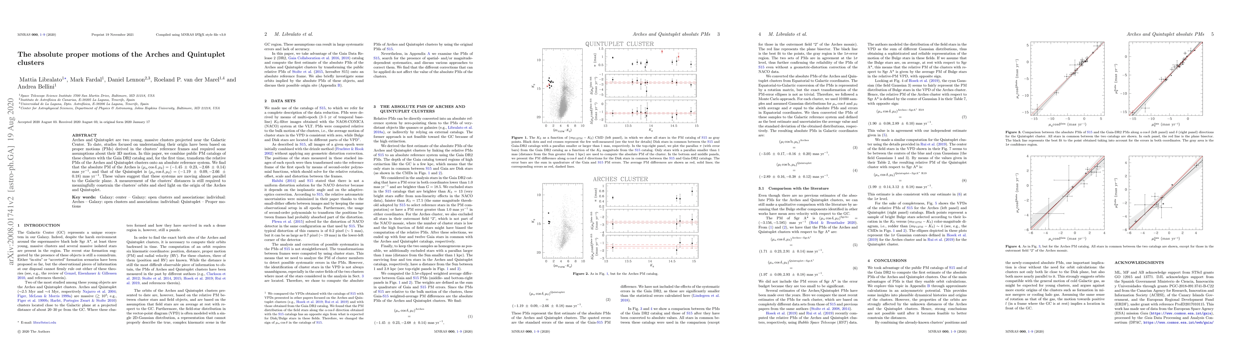 This paper determines the absolute proper motions of the Arches and Quintuplet star clusters near the Galactic Center, finding them to move almost parallel to the Galactic plane. The study combines Gaia DR2 data with existing proper motion catalogs to achieve this, revealing the Arches' proper motion as $(-1.45\ \pm\ 0.23,-2.68\ \pm\ 0.14)$ mas yr$^{-1}$ and the Quintuplet's as $(-1.19\ \pm\ 0.09,-2.66\ \pm\ 0.18)$ mas yr$^{-1}$.