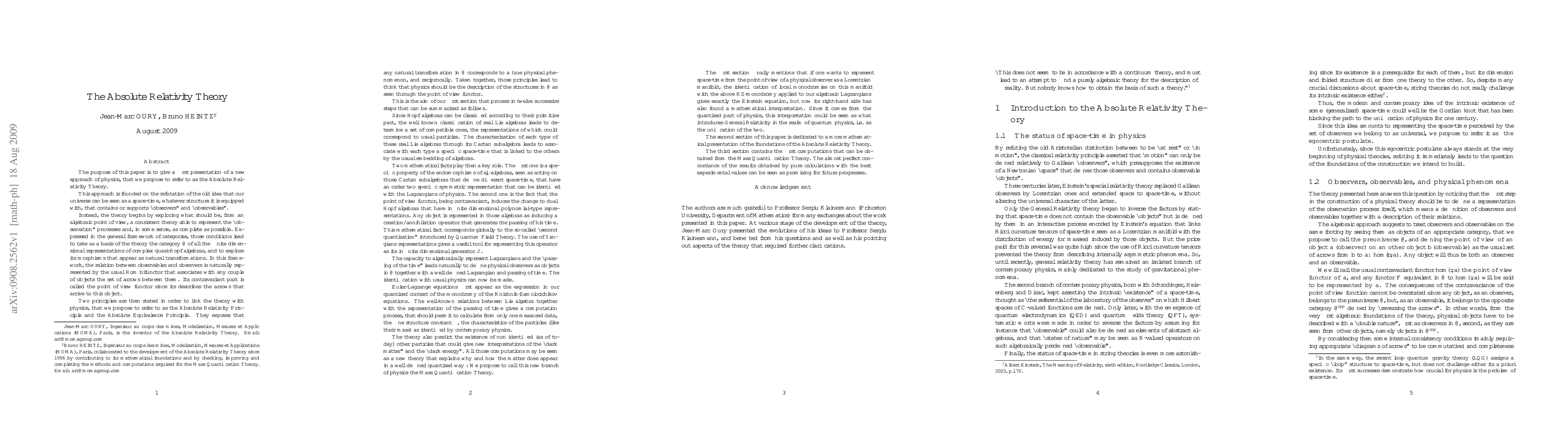 This paper is a first presentation of a new approach of physics that we propose to refer as the Absolute Relativity Theory (ART) since it refutes the idea of a pre-existing space-time. It includes an algebraic definition of particles, interactions and Lagrangians. It proposed also a purely algebraic explanation of the passing of time phenomenon that leads to see usual Euler-Lagrange equations as the continuous version of the Knizhnik-Zamolodchikov monodromy. The identification of this monodromy with the local ones of the Lorentzian manifolds gives the Einstein equation algebraically explained in a quantized context. A fact that could lead to the unification of physics. By giving an algebraic classification of particles and interactions, the ART also proposes a new branch of physics, namely the Mass Quantification Theory, that provides a general method to calculate the characteristics of particles and interactions. Some examples are provided. The MQT also predicts the existence of as of today not yet observed particles that could be part of the dark matter. By giving a new interpretation of the weak interaction, it also suggests an interpretation of the so-called dark energy.