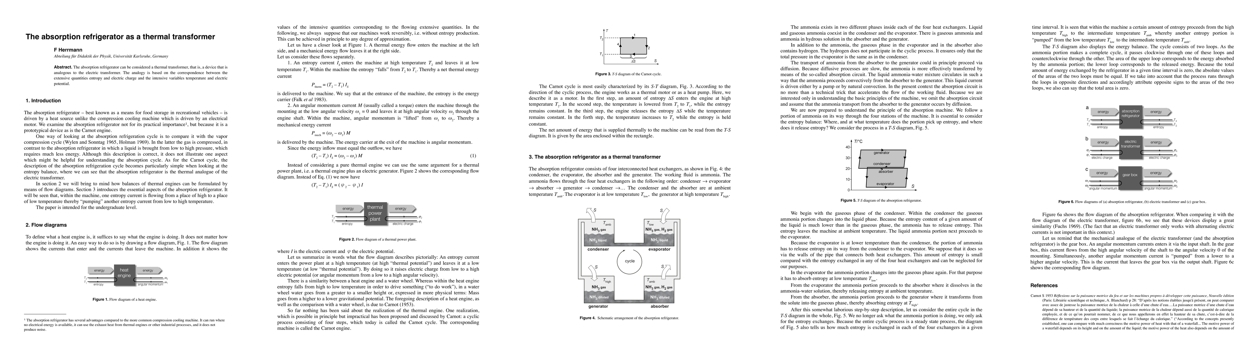 The absorption refrigerator can be considered a thermal transformer, i.e. a device that is analogous to the electric transformer. The analogy is based on a correspondence between the extensive quantities entropy and electric charge and that of the intensive variables temperature and electric potential.