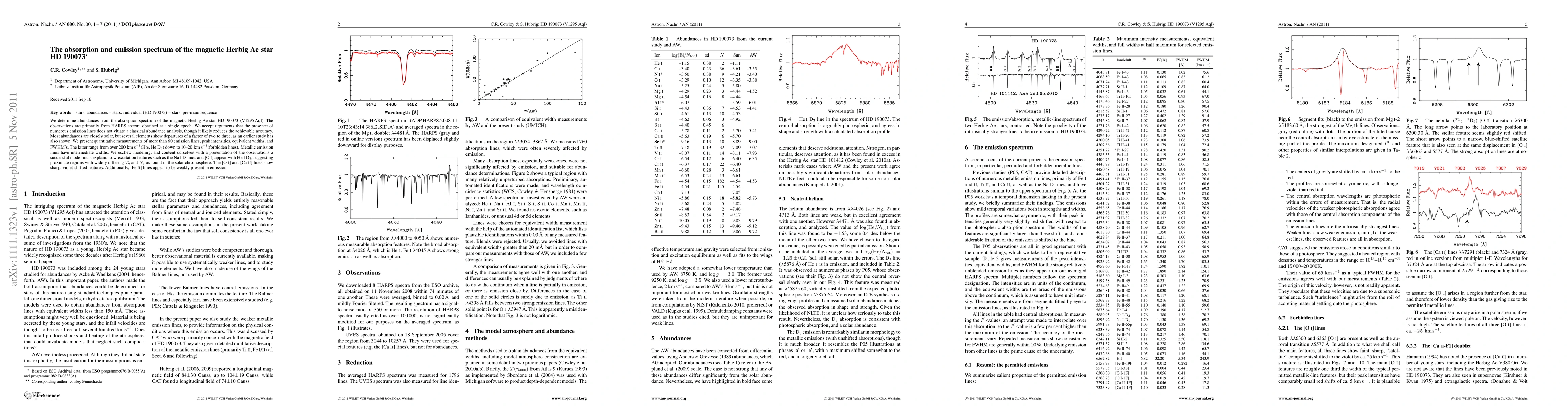 We determine abundances from the absorption spectrum of the magnetic Herbig Ae star HD 190073 (V1295 Aql). The observations are primarily from HARPS spectra obtained at a single epoch. We accept arguments that the presence of numerous emission lines does not vitiate a classical abundance analysis, though it likely reduces the achievable accuracy. Most abundances are closely solar, but several elements show departures of a factor of two to three, as an earlier study has also shown. We present quantitative measurements of more than 60 emission lines, peak intensities, equivalent widths, and FWHM's. The latter range from over 200 km/s (H-alpha, He D3) down to 10--20 km/s (forbidden lines). Metallic emission lines have intermediate widths. We eschew modeling, and content ourselves with a presentation of the observations a successful model must explain. Low-excitation features such as the Na I D-lines and [O I] appear with He I D3, suggesting proximate regions with widely differing Te and Ne as found in the solar chromosphere. The [O I] and [Ca II] lines show sharp, violet-shifted features. Additionally, [Fe II] lines appear to be weakly present in emission.