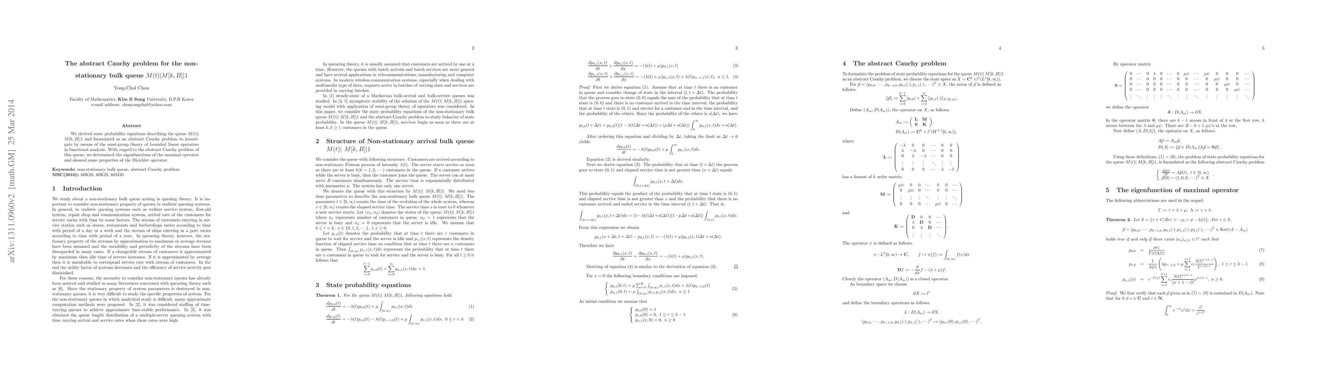 Researchers investigated the non-stationary bulk queue using semi-group theory to solve an abstract Cauchy problem, finding properties of the Dirichlet operator.