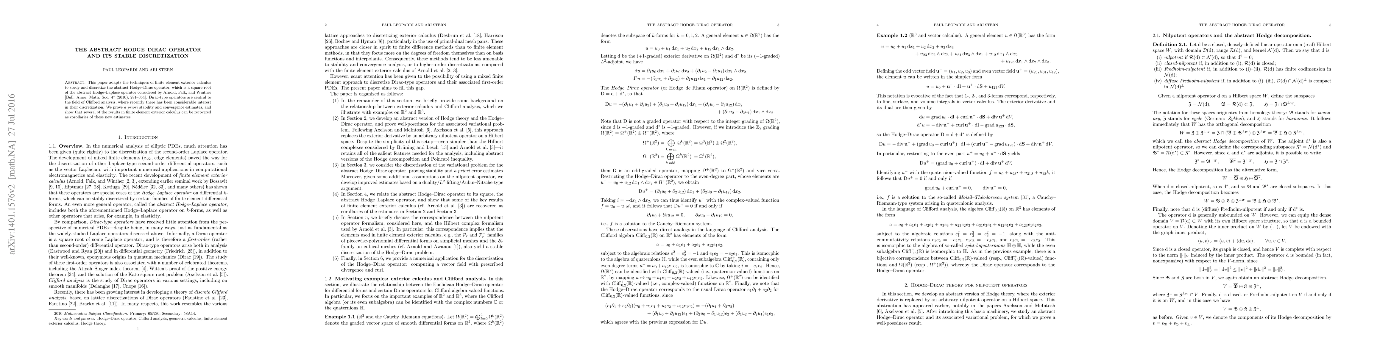 This paper adapts the techniques of finite element exterior calculus to study and discretize the abstract Hodge-Dirac operator, which is a square root of the abstract Hodge-Laplace operator considered by Arnold, Falk, and Winther [Bull. Amer. Math. Soc. 47 (2010), 281-354]. Dirac-type operators are central to the field of Clifford analysis, where recently there has been considerable interest in their discretization. We prove a priori stability and convergence estimates, and show that several of the results in finite element exterior calculus can be recovered as corollaries of these new estimates.