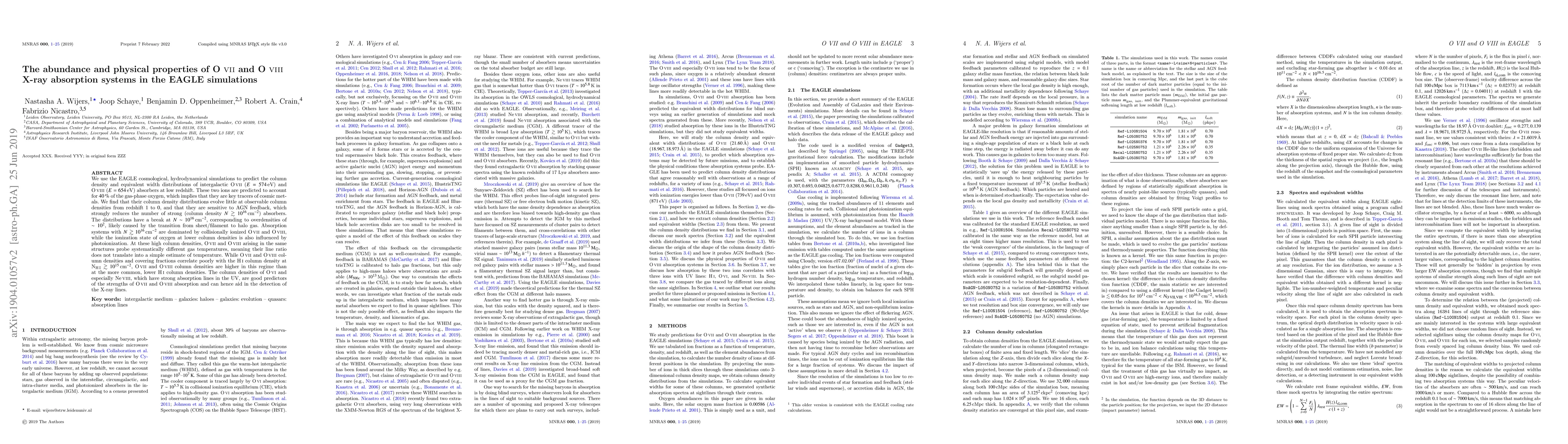 The EAGLE simulations predict that O VII and O VIII absorbers account for 40% of gas-phase oxygen and are significant tracers of cosmic metals. These absorbers show minimal evolution in column density distributions from redshift 1 to 0, with strong absorbers significantly reduced by AGN feedback.