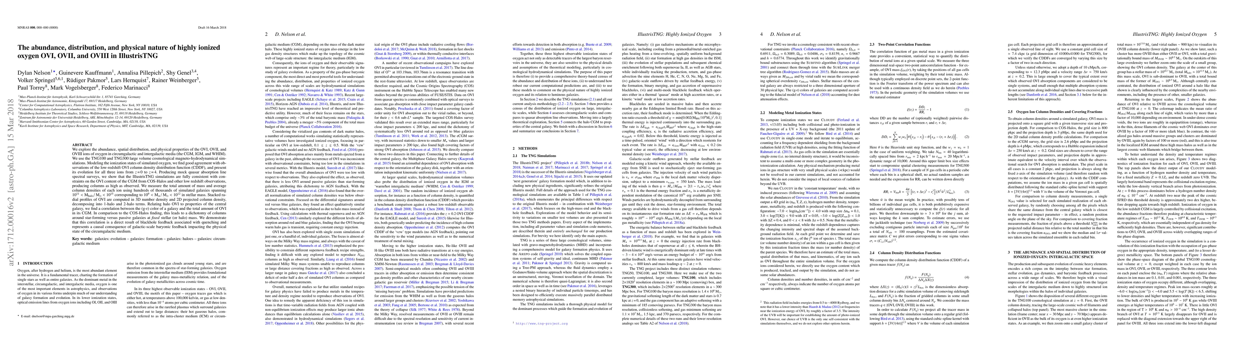 We explore the abundance, spatial distribution, and physical properties of the OVI, OVII, and OVIII ions of oxygen in circumgalactic and intergalactic media (the CGM, IGM, and WHIM). We use the TNG100 and TNG300 large volume cosmological magneto-hydrodynamical simulations. Modeling the ionization states of simulated oxygen, we find good agreement with observations of the low-redshift OVI column density distribution function (CDDF), and present its evolution for all three ions from z=0 to z=4. Producing mock quasar absorption line spectral surveys, we show that the IllustrisTNG simulations are fully consistent with constraints on the OVI content of the CGM from COS-Halos and other low redshift observations, producing columns as high as observed. We measure the total amount of mass and average column densities of each ion using hundreds of thousands of simulated galaxies spanning 10^11 < Mhalo/Msun < 10^15 corresponding to 10^9 < M*/Msun < 10^12 in stellar mass. Stacked radial profiles of OVI are computed in 3D number density and 2D projected column, decomposing into the 1-halo and 2-halo terms. Relating halo OVI to properties of the central galaxy, we find a correlation between the (g-r) color of a galaxy and the total amount of OVI in its CGM. In comparison to the COS-Halos finding, this leads to a dichotomy of columns around star-forming versus passive galaxies at fixed stellar (or halo) mass. We demonstrate that this correlation is a direct result of blackhole feedback associated with quenching and represents a causal consequence of galactic-scale baryonic feedback impacting the physical state of the circumgalactic medium.