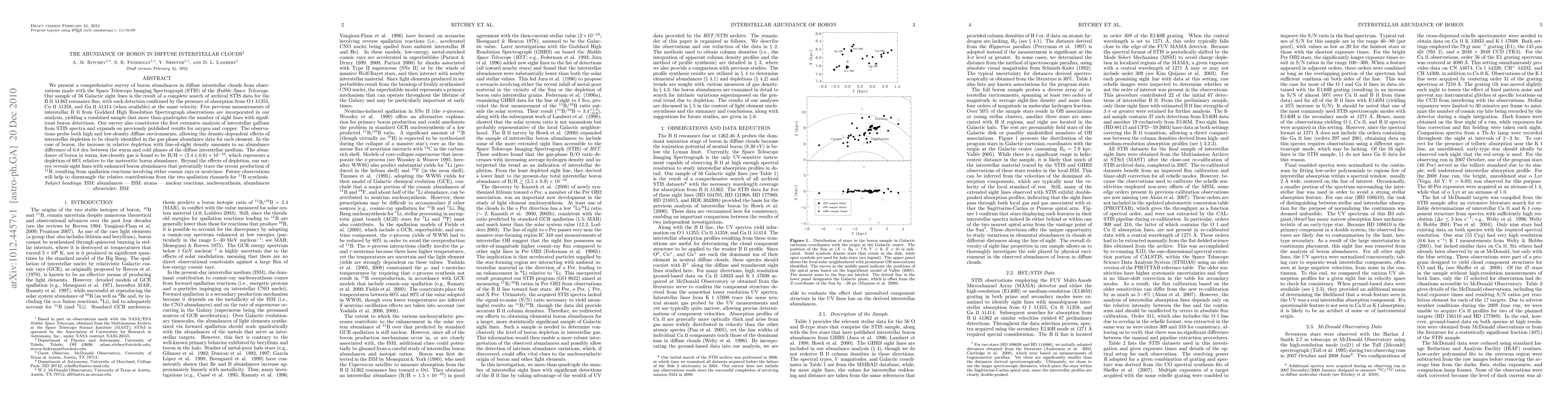 The research surveyed 56 Galactic sight lines using the Hubble Space Telescope's STIS for boron abundances in diffuse interstellar clouds. Findings indicate a 60% depletion of boron in warm, low-density gas and suggest enhanced boron abundances may trace recent 11B production via spallation reactions. The study also presents the first extensive analysis of interstellar gallium from STIS spectra.