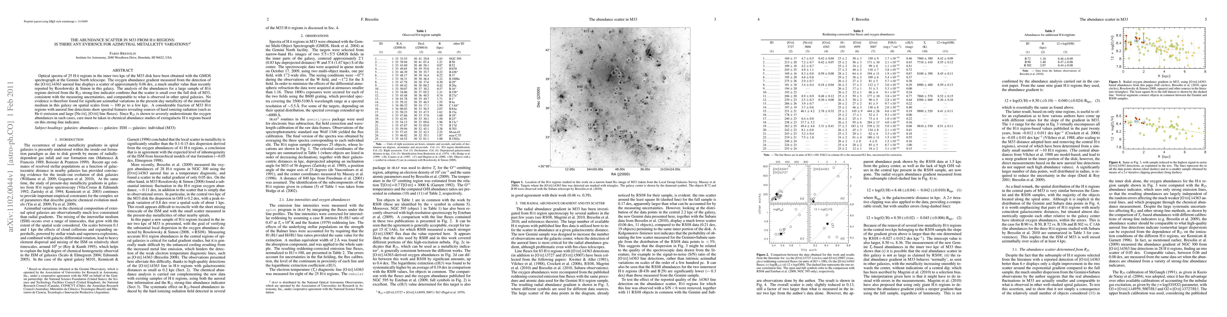 This study analyzes optical spectra of 25 H II regions in M33, finding a small oxygen abundance scatter of 0.06 dex, indicating no significant azimuthal metallicity variations across the galaxy. Caution is advised when using the R23 indicator due to its underestimation of oxygen abundances in regions with hard ionizing radiation.