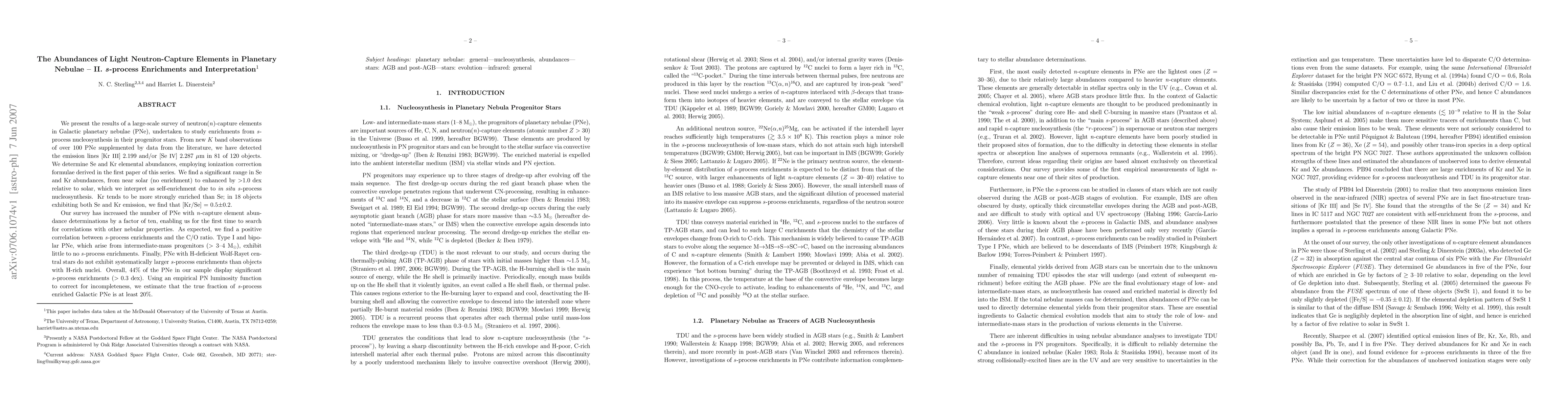 A study of 100 planetary nebulae found significant enrichments of light neutron-capture elements in 44% of the sample, with a positive correlation between s-process enrichment and C/O ratio, indicating in situ nucleosynthesis in their progenitor stars.