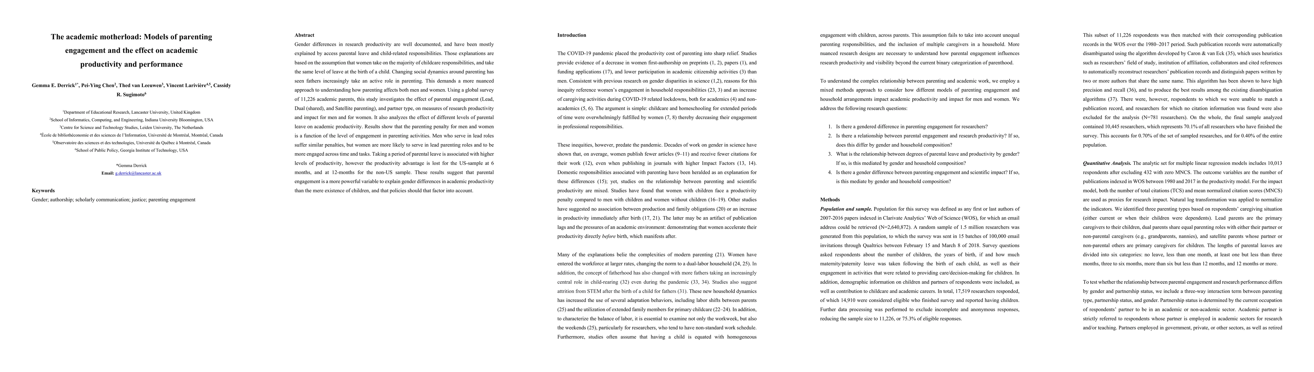 This study explores how different models of parental engagement impact academic productivity among men and women, using a global survey of 11,226 academic parents. It finds that the level of parental engagement, rather than just the presence of children, is a significant factor in gender differences in academic productivity, with women more likely to engage in lead parenting roles.