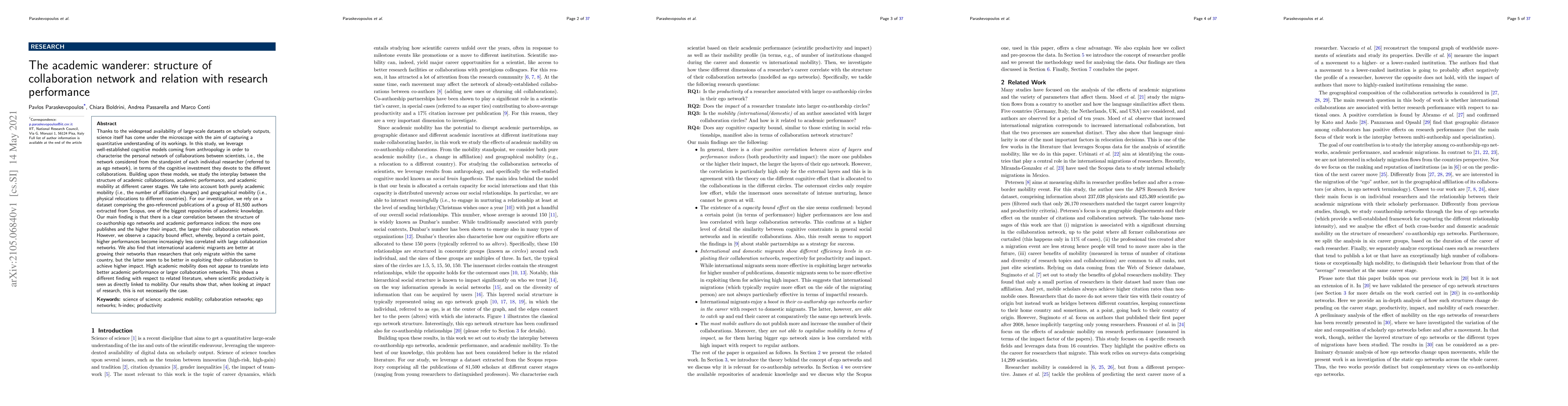 Thanks to the widespread availability of large-scale datasets on scholarly outputs, science itself has come under the microscope with the aim of capturing a quantitative understanding of its workings. In this study, we leverage well-established cognitive models coming from anthropology in order to characterise the personal network of collaborations between scientists, i.e., the network considered from the standpoint of each individual researcher (referred to as ego network), in terms of the cognitive investment they devote to the different collaborations. Building upon these models, we study the interplay between the structure of academic collaborations, academic performance, and academic mobility at different career stages. We take into account both purely academic mobility (i.e., the number of affiliation changes) and geographical mobility (i.e., physical relocations to different countries). For our investigation, we rely on a dataset comprising the geo-referenced publications of a group of 81,500 authors extracted from Scopus, one of the biggest repositories of academic knowledge. Our main finding is that there is a clear correlation between the structure of co-authorship ego networks and academic performance indices: the more one publishes and the higher their impact, the larger their collaboration network. However, we observe a capacity bound effect, whereby, beyond a certain point, higher performances become increasingly less correlated with large collaboration networks. We also find that international academic migrants are better at growing their networks than researchers that only migrate within the same country, but the latter seem to be better in exploiting their collaboration to achieve higher impact. High academic mobility does not appear to translate into better academic performance or larger collaboration networks.