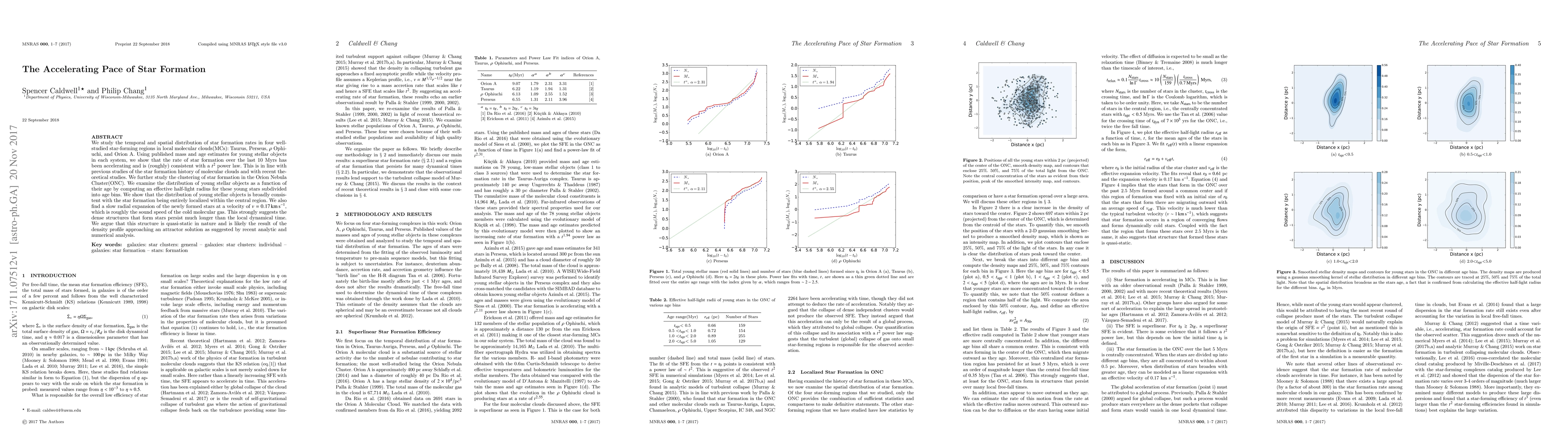 We study the temporal and spatial distribution of star formation rates in four well-studied star-forming regions in local molecular clouds(MCs): Taurus, Perseus, $\rho$ Ophiuchi, and Orion A. Using published mass and age estimates for young stellar objects in each system, we show that the rate of star formation over the last 10 Myrs has been accelerating and is (roughly) consistent with a $t^2$ power law. This is in line with previous studies of the star formation history of molecular clouds and with recent theoretical studies. We further study the clustering of star formation in the Orion Nebula Cluster(ONC). We examine the distribution of young stellar objects as a function of their age by computing an effective half-light radius for these young stars subdivided into age bins. We show that the distribution of young stellar objects is broadly consistent with the star formation being entirely localized within the central region. We also find a slow radial expansion of the newly formed stars at a velocity of $v=0.17\,{\rm km\,s}^{-1}$, which is roughly the sound speed of the cold molecular gas. This strongly suggests the dense structures that form stars persist much longer than the local dynamical time. We argue that this structure is quasi-static in nature and is likely the result of the density profile approaching an attractor solution as suggested by recent analytic and numerical analysis.