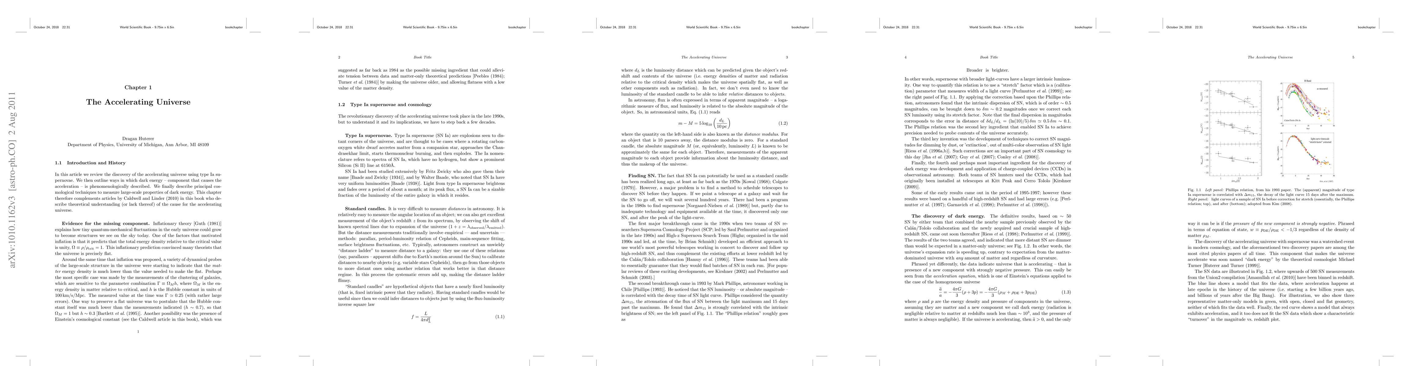 In this article we review the discovery of the accelerating universe using type Ia supernovae. We then outline ways in which dark energy - component that causes the acceleration - is phenomenologically described. We finally describe principal cosmological techniques to measure large-scale properties of dark energy. This chapter complements other articles in this book that describe theoretical understanding (or lack thereof) of the cause for the accelerating universe.