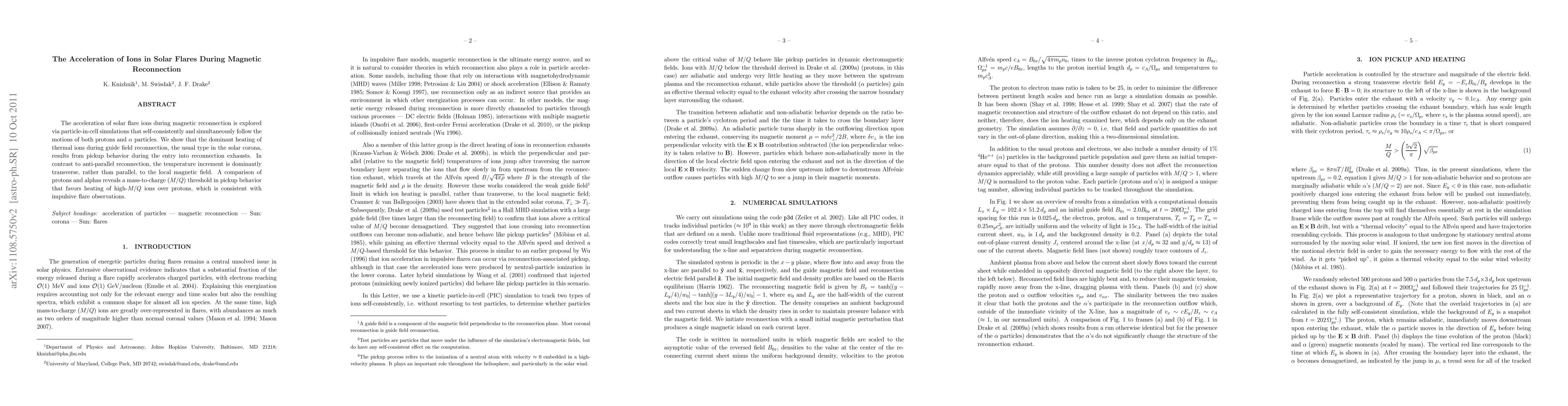 This paper uses particle-in-cell simulations to study ion acceleration in solar flares during magnetic reconnection, showing that high mass-to-charge ions are preferentially heated due to pickup behavior, with temperature increments predominantly transverse to the local magnetic field.