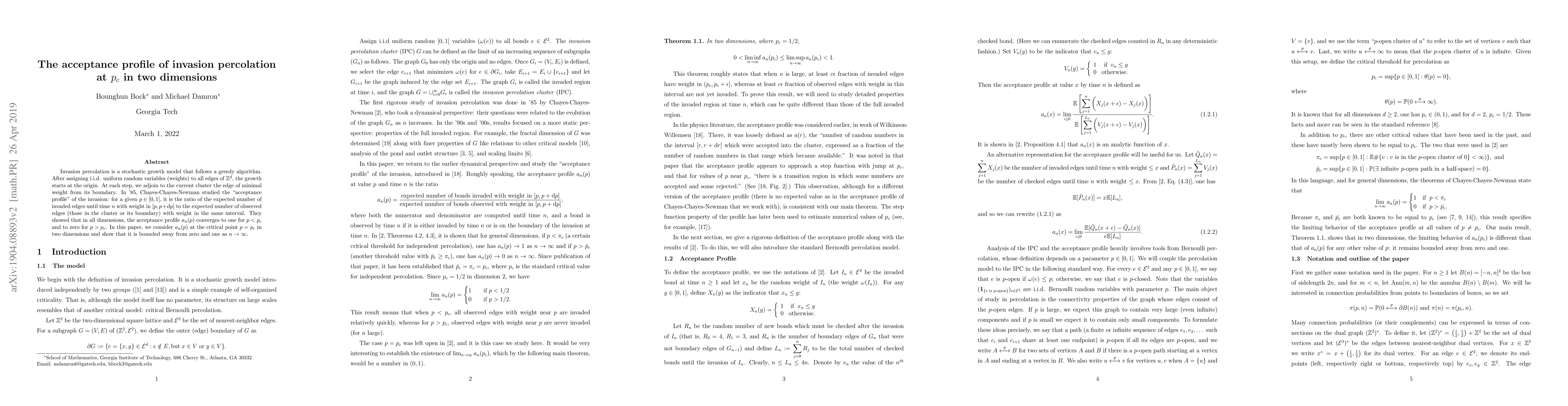 '85, Chayes-Chayes-Newman studied the `acceptance profile' of the invasion: for