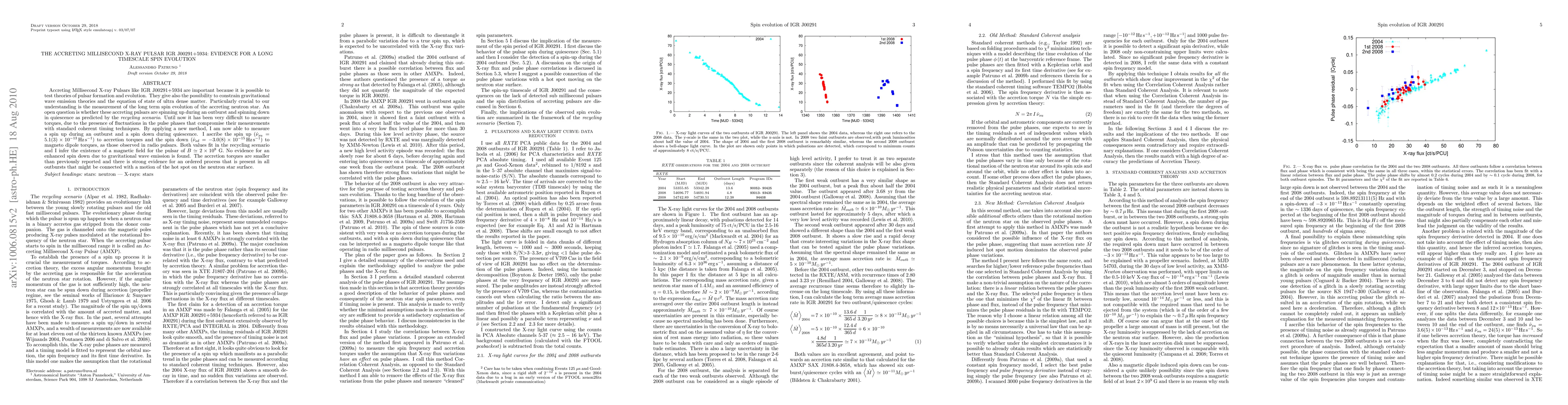 Accreting Millisecond X-ray Pulsars like IGR J00291+5934 are important because it is possible to test theories of pulsar formation and evolution. They give also the possibility to constrain gravitational wave emission theories and the equation of state of ultra dense matter. Particularly crucial to our understanding is the measurement of the long term spin evolution of the accreting neutron star. An open question is whether these accreting pulsars are spinning up during an outburst and spinning down in quiescence as predicted by the recycling scenario. Until now it has been very difficult to measure torques, due to the presence of fluctuations in the pulse phases that compromise their measurements with standard coherent timing techniques. By applying a new method, I am now able to measure a spin up during an outburst and a spin down during quiescence. I ascribe the spin up (Fdot=5.1(3)x10^{-13}\Hz/s) to accretion torques and the spin down (Fdot=-3.0(8)x10^{-15} Hz/s) to magneto dipole torques, as those observed in radio pulsars. Both values nicely fit in the recycling scenario and I infer the existence of a magnetic field for the pulsar of B~2x10^{8} G. No evidence for an enhanced spin down due to gravitational wave emission is found. The accretion torques are smaller than previously reported and there is strong evidence for an ordered process that is present in all outbursts that might be connected with a motion of the hot spot on the neutron star surface.