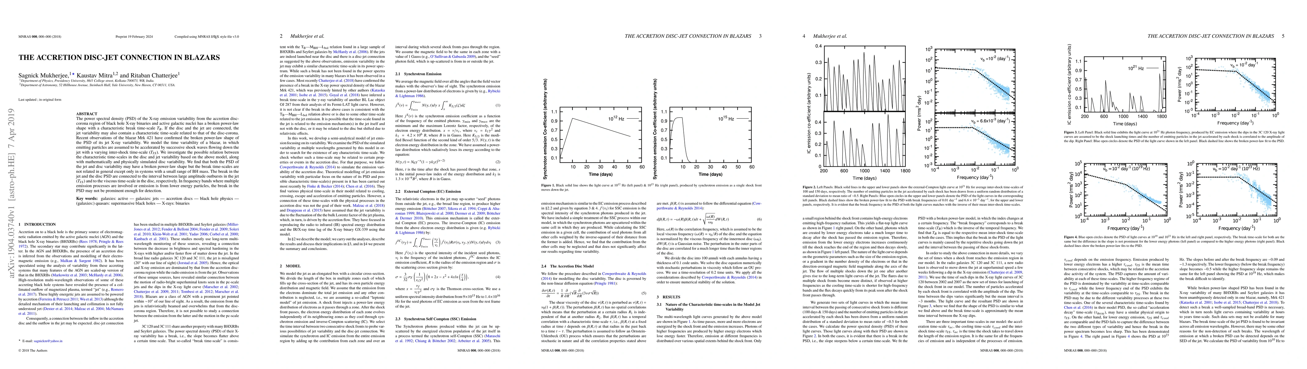 The power spectral density (PSD) of the X-ray emission variability from the accretion disc-corona region of black hole X-ray binaries and active galactic nuclei has a broken power law shape with a characteristic break time-scale. If the disc and the jet are connected, the jet variability may also contain a characteristic time-scale related to that of the disc-corona. Recent observations of the blazar Mrk 421 have confirmed the broken power law shape of the PSD of its jet X-ray variability. We model the time variability of a blazar, in which emitting particles are assumed to be accelerated by successive shock waves flowing down the jet with a varying inter-shock time-scale. We investigate the possible relation between the characteristic time-scales in the disc and jet variability based on the above model, along with mathematically and physically simulated disc variability. We find that both the PSD of the jet and disc variability may have a broken power law shape but the break time-scales are not related in general except only in systems with a small range of BH mass. The break in the jet and the disc PSD are connected to the interval between large amplitude outbursts in the jet (inter-shock time-scale) and to the viscous time-scale in the disc, respectively. In frequency bands where multiple emission processes are involved or emission is from lower energy particles, the break in the PSD may not be prominent enough for detection.