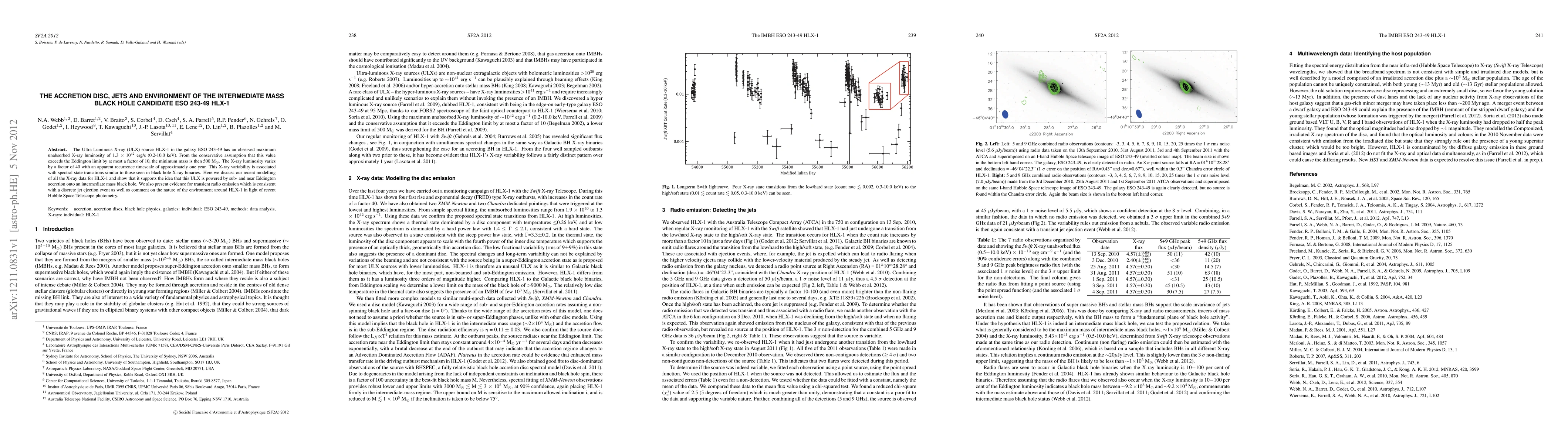 The Ultra Luminous X-ray (ULX) source HLX-1 in the galaxy ESO 243-49 has an observed maximum unabsorbed X-ray luminosity of 1.3e42 erg/s (0.2-10.0 keV). From the conservative assumption that this value exceeds the Eddington limit by at most a factor of 10, the minimum mass is then 500 solar masses. The X-ray luminosity varies by a factor of 40 with an apparent recurrence timescale of approximately one year. This X-ray variability is associated with spectral state transitions similar to those seen in black hole X-ray binaries. Here we discuss our recent modelling of all the X-ray data for HLX-1 and show that it supports the idea that this ULX is powered by sub- and near Eddington accretion onto an intermediate mass black hole. We also present evidence for transient radio emission which is consistent with a discrete jet ejection event as well as comment on the nature of the environment around HLX-1 in light of recent Hubble Space Telescope photometry.