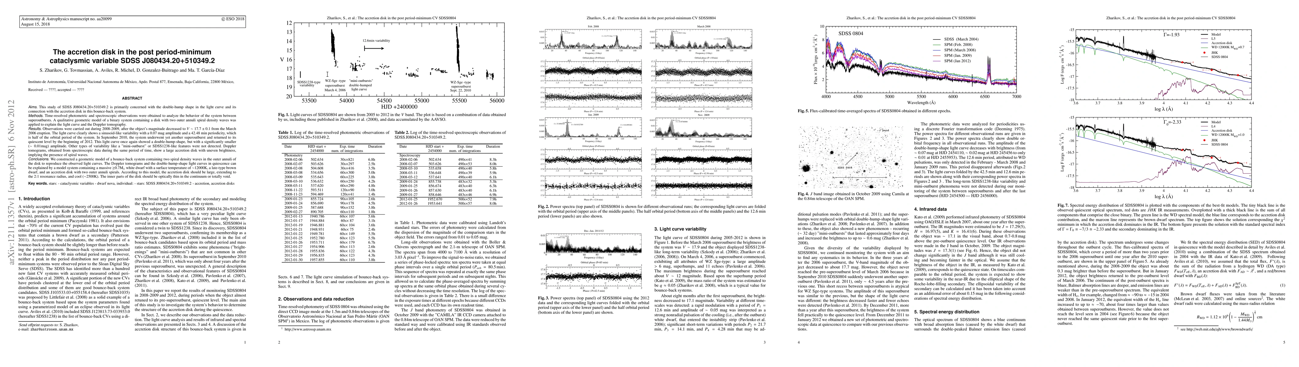 This study of SDSS0804 is primarily concerned with the double-hump shape in the light curve and its connection with the accretion disk in this bounce-back system. Time-resolved photometric and spectroscopic observations were obtained to analyze the behavior of the system between superoutbursts. A geometric model of a binary system containing a disk with two outer annuli spiral density waves was applied to explain the light curve and the Doppler tomography. Observations were carried out during 2008-2009, after the object's magnitude decreased to V~17.7(0.1) from the March 2006 eruption. The light curve clearly shows a sinusoid-like variability with a 0.07 mag amplitude and a 42.48 min periodicity, which is half of the orbital period of the system. In Sept. 2010, the system underwent yet another superoutburst and returned to its quiescent level by the beginning of 2012. This light curve once again showed a double-humps, but with a significantly smaller ~0.01mag amplitude. Other types of variability like a "mini-outburst" or SDSS1238-like features were not detected. Doppler tomograms, obtained from spectroscopic data during the same period of time, show a large accretion disk with uneven brightness, implying the presence of spiral waves. We constructed a geometric model of a bounce-back system containing two spiral density waves in the outer annuli of the disk to reproduce the observed light curves. The Doppler tomograms and the double-hump-shape light curves in quiescence can be explained by a model system containing a massive >0.7Msun white dwarf with a surface temperature of ~12000K, a late-type brown dwarf, and an accretion disk with two outer annuli spirals. According to this model, the accretion disk should be large, extending to the 2:1 resonance radius, and cool (~2500K). The inner parts of the disk should be optically thin in the continuum or totally void.