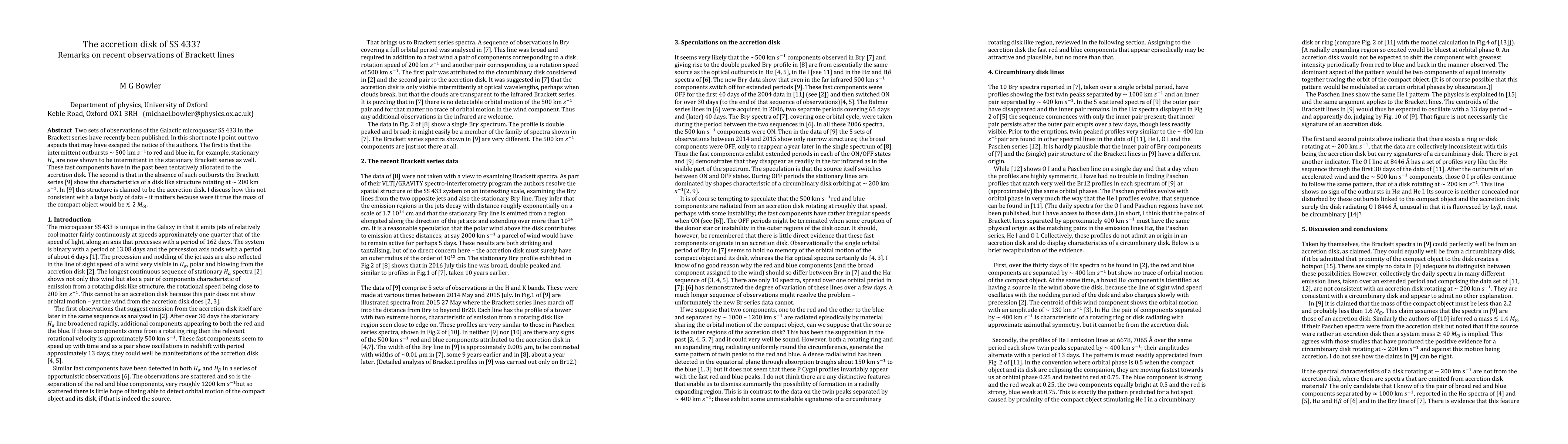 I discuss two points concerning recent Brackett series spectra of SS 433. The first is that outbursts to red and blue episodic in the Balmer series are now shown to be episodic in the far infrared Brackett series. The second point is that while in quiet times the Brackett profiles are characteristic of a disk rotating at ~ 200 km/s, such a disk is not the accretion disk and it should not be claimed that these profiles require a compact object mass less than 2.2 solar masses.