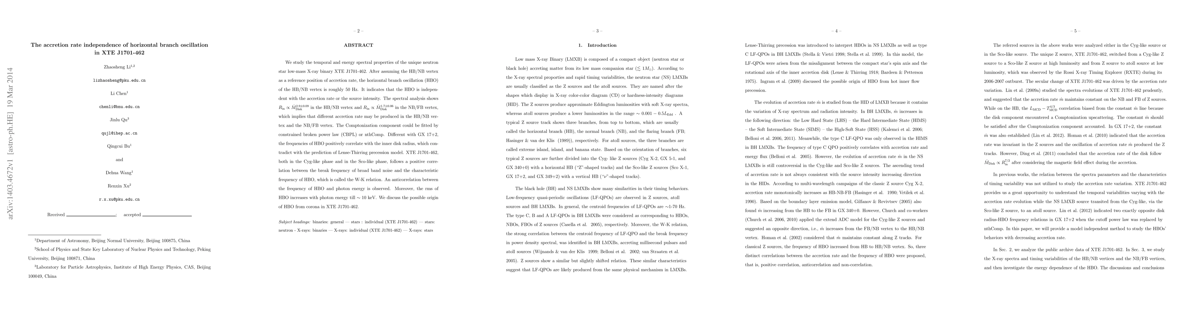 The horizontal branch oscillation in XTE J1701-462 is found to be independent of accretion rate, with a frequency of 50 Hz, and shows a positive correlation with the inner disk radius. The study discusses possible origins from coronal structures.