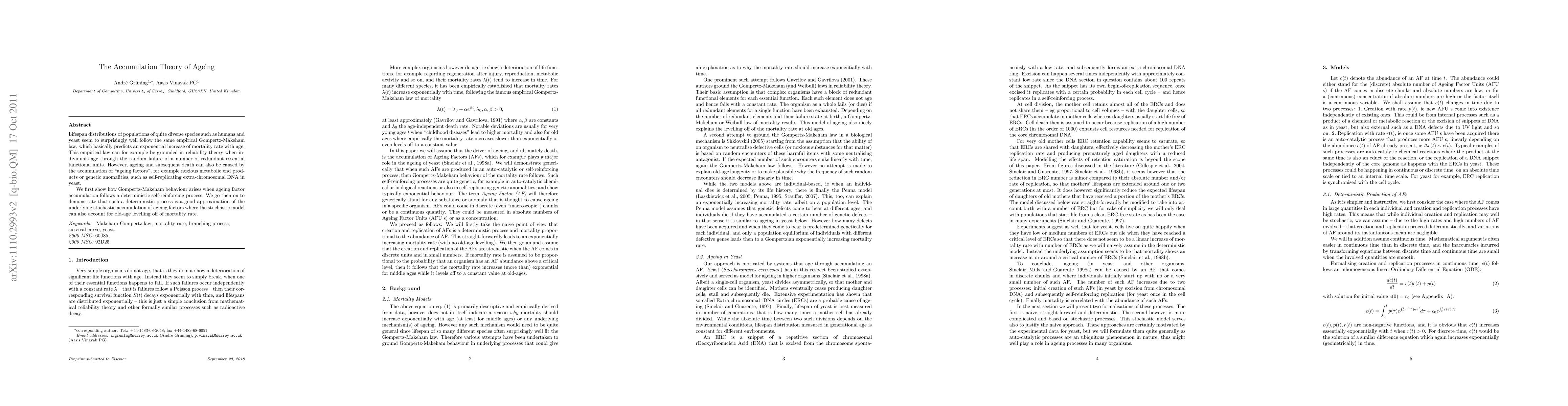 Lifespan distributions of populations of quite diverse species such as humans and yeast seem to surprisingly well follow the same empirical Gompertz-Makeham law, which basically predicts an exponential increase of mortality rate with age. This empirical law can for example be grounded in reliability theory when individuals age through the random failure of a number of redundant essential functional units. However, ageing and subsequent death can also be caused by the accumulation of "ageing factors", for example noxious metabolic end products or genetic anomalities, such as self-replicating extra-chromosomal DNA in yeast. We first show how Gompertz-Makeham behaviour arises when ageing factor accumulation follows a deterministic self-reinforcing process. We go then on to demonstrate that such a deterministic process is a good approximation of the underlying stochastic accumulation of ageing factors where the stochastic model can also account for old-age levelling off of mortality rate.