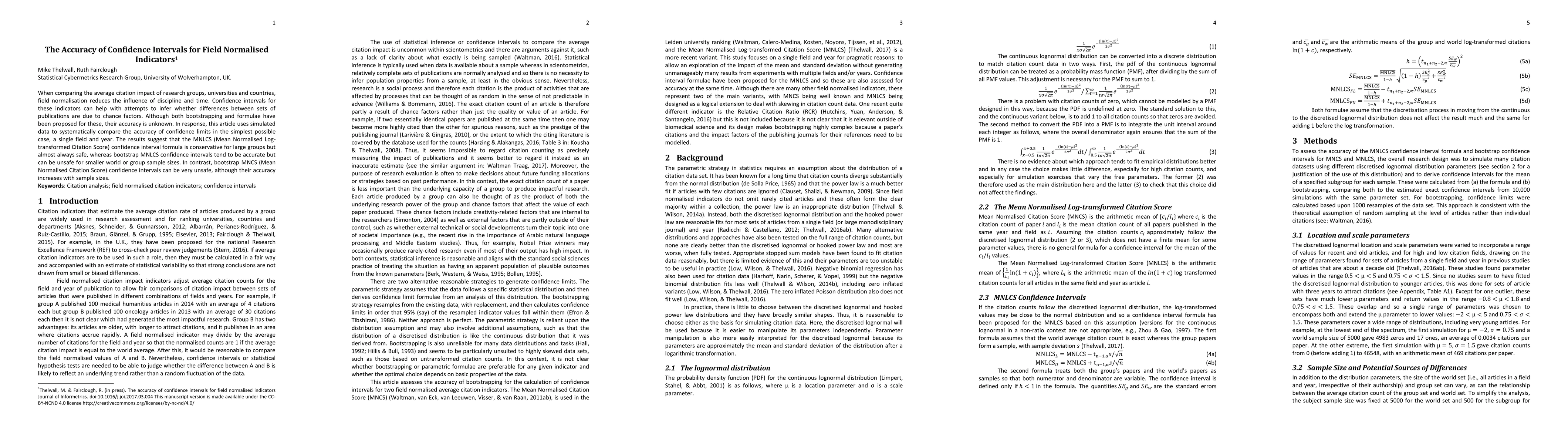 This paper examines the accuracy of confidence intervals for field normalised citation impact indicators, comparing MNLCS and bootstrap methods. The MNLCS formula is found to be conservative for large groups, while bootstrap methods are accurate but risky for smaller sample sizes.