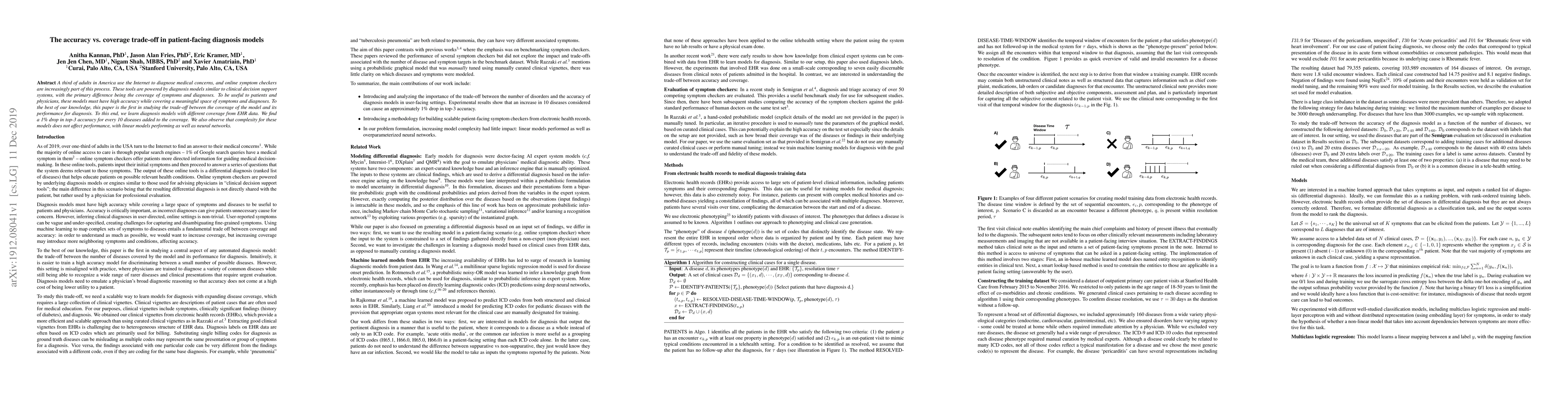 This paper investigates the trade-off between the coverage and accuracy of patient-facing diagnosis models, finding a 1% drop in top-3 accuracy for every 10 additional diseases considered. It concludes that model complexity does not significantly impact performance, with linear models performing as effectively as neural networks.