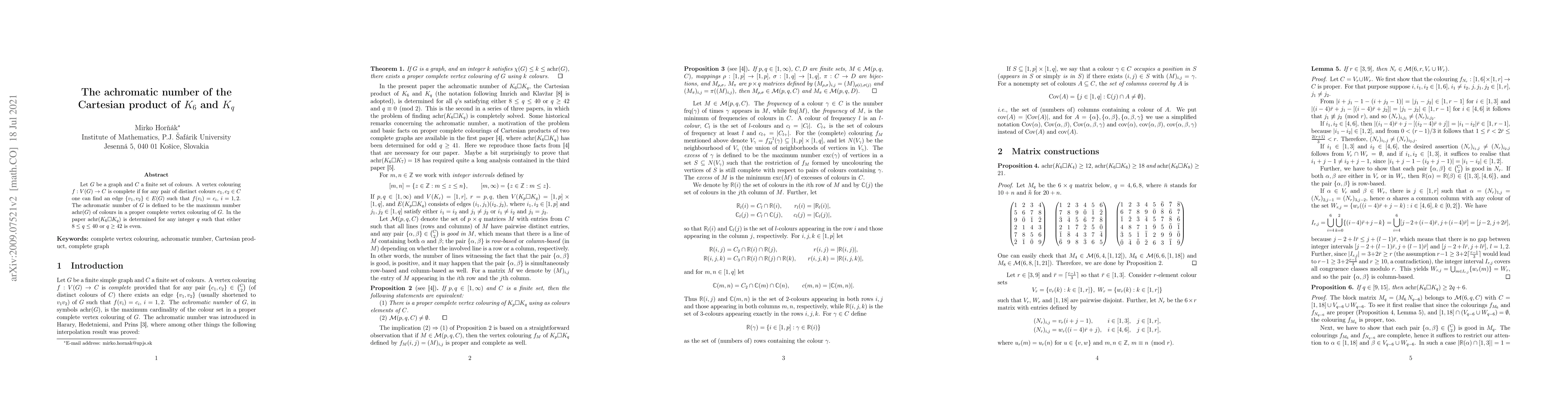 Let $G$ be a graph and $C$ a finite set of colours. A vertex colouring $f:V(G)\to C$ is complete if for any pair of distinct colours $c_1,c_2\in C$ one can find an edge $\{v_1,v_2\}\in E(G)$ such that $f(v_i)=c_i$, $i=1,2$. The achromatic number of $G$ is defined to be the maximum number $\mathrm{achr}(G)$ of colours in a proper complete vertex colouring of $G$. In the paper $\mathrm{achr}(K_6\square K_q)$ is determined for any integer $q$ such that either $8\le q\le40$ or $q\ge42$ is even.